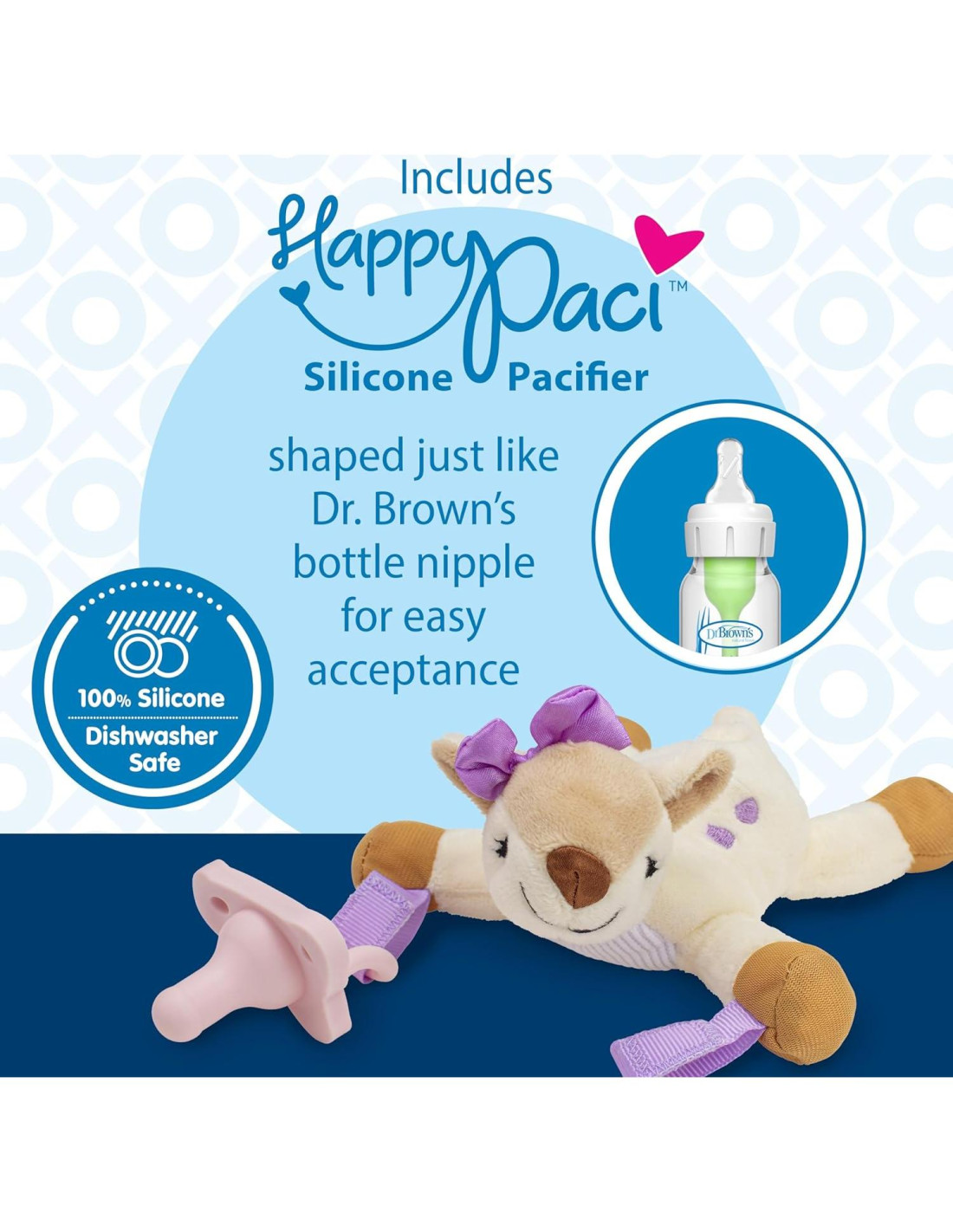 - PORTACHUPETES Y MORDEDORES PARA BEBÉS. Diseñado para mantener los chupetes y mordedores del bebé cerca, el Lovey sostiene de manera segura la mayoría de los chupetes y mordedores e incluye un chupete HappyPaci de silicona 100% de Dr. Brown.