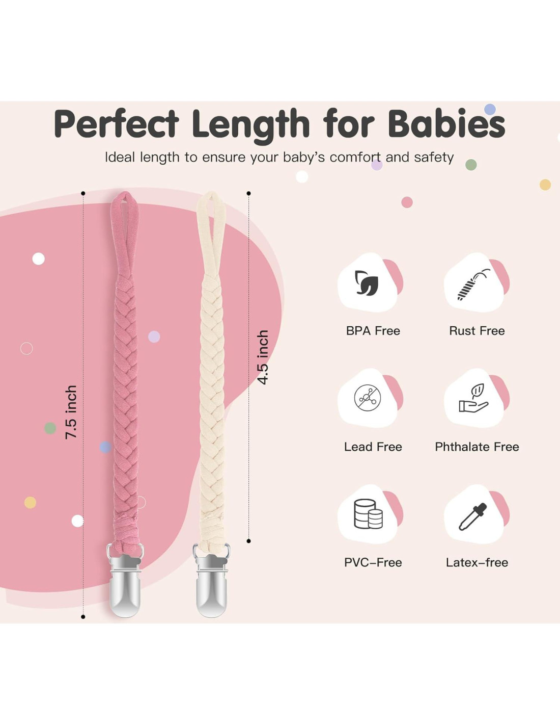 - [100% Algodón Confort] : Los clips de soporte de chupete hechos de algodón suave y transpirable al 100%, nuestros clips de chupete para bebés proporcionan un confort excepcional para tu pequeño. Libres de plomo, pinturas dañinas y ftalatos, diseñados pensando en la piel sensible de tu bebé, estos clips de soporte de chupete son suaves al tacto y altamente duraderos, asegurando un uso prolongado.