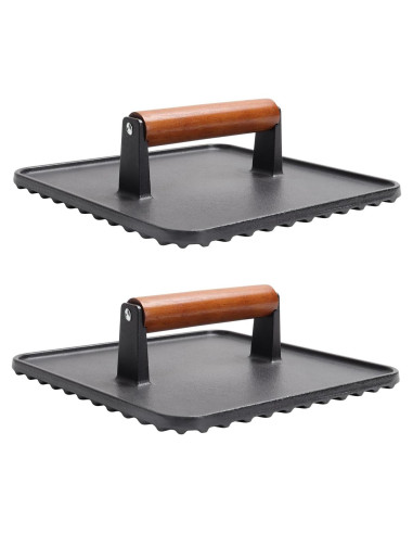 - Prensa de hamburguesas de hierro fundido pesada y robusta: Hecha de hierro fundido más grueso y pesado, nuestra prensa para hamburguesas y tocino aplana sin esfuerzo las hamburguesas, aplana el tocino y permite que los alimentos se calienten de manera uniforme, ahorrando tiempo de cocción. El mango está hecho de madera sólida natural resistente al calor para robustez y durabilidad, lo que te permite asar cómodamente y de manera segura.