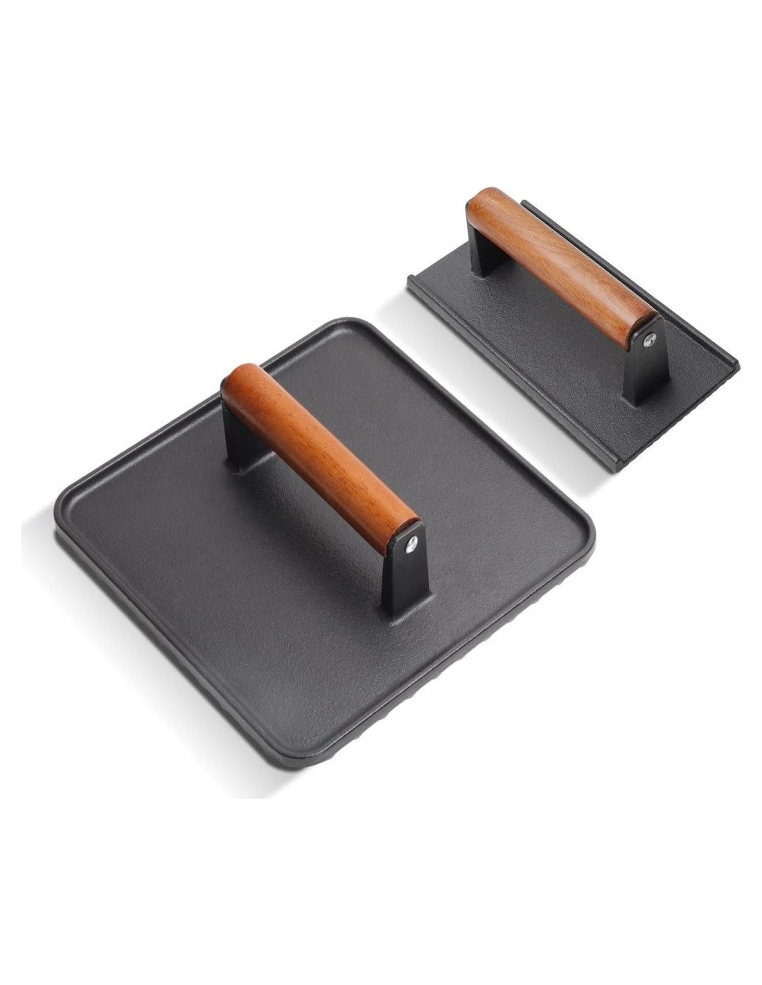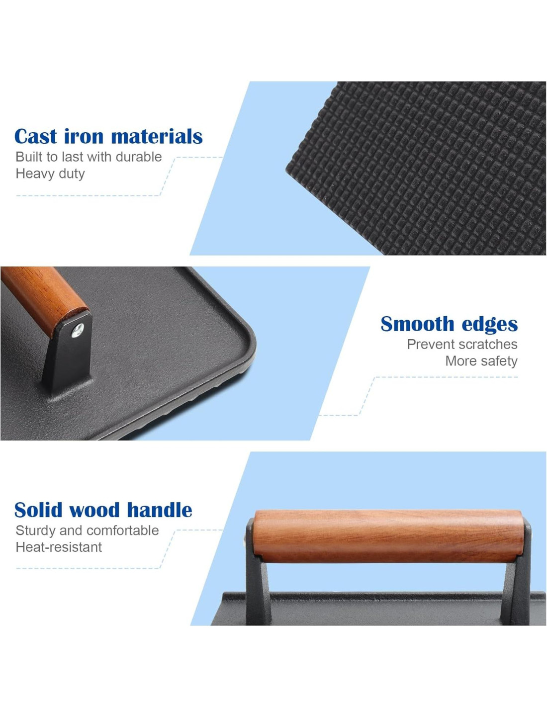 - Pesada y robusta prensa de tocino grande rectangular y cuadrada de 10" de hierro fundido: Hecha de hierro fundido más grueso y pesado, nuestra prensa de tocino para hamburguesas aplasta hamburguesas sin esfuerzo, aplana el tocino y permite que la comida se caliente de manera uniforme, ahorrando tiempo de cocción. El mango está hecho de madera natural resistente al calor para robustez y durabilidad, permitiéndote asar cómodamente y de manera segura.