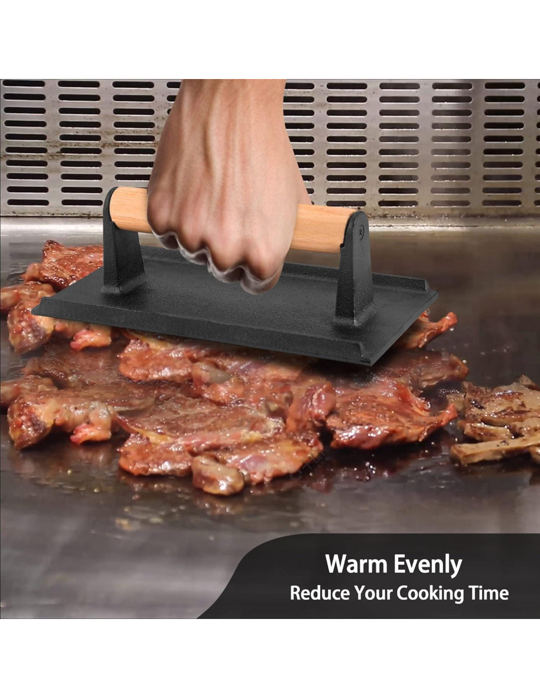 - Prensa de parrilla de alta resistencia, la prensa de parrilla rectangular y redonda está hecha de hierro fundido de grado alimenticio 100% sin ningún recubrimiento dañino que se libere en tu comida, resistente y a prueba de corrosión, la prensa de parrilla con gran superficie puede presionar más comida a la vez, aplanando la carne y manteniendo su forma, las ranuras en línea y las ranuras en cuadrícula en la parte inferior antiadherente pueden formar hermosas marcas de parrilla en la carne, aumentando el atractivo visual