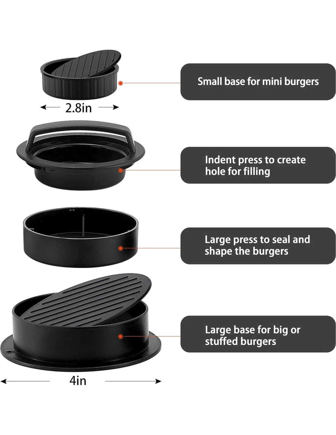 Nuestro conjunto de prensa de hamburguesas es el accesorio perfecto para asar y cocinar que te ayudará a hacer hamburguesas sabrosas. Con el molde para hacer hamburguesas, no se necesita esfuerzo para hacer algunas deliciosas hamburguesas rellenas como hamburguesa de macarrones con queso, hamburguesa hawaiana, hamburguesa cordon bleu de pollo, hamburguesa de chile y hamburguesa de pizza. La prensa de hamburguesas puede presionar la grasa no deseada para hacerlas más saludables, dejando la marca de la parrilla en la hamburguesa, también reduce el tiempo de cocción.