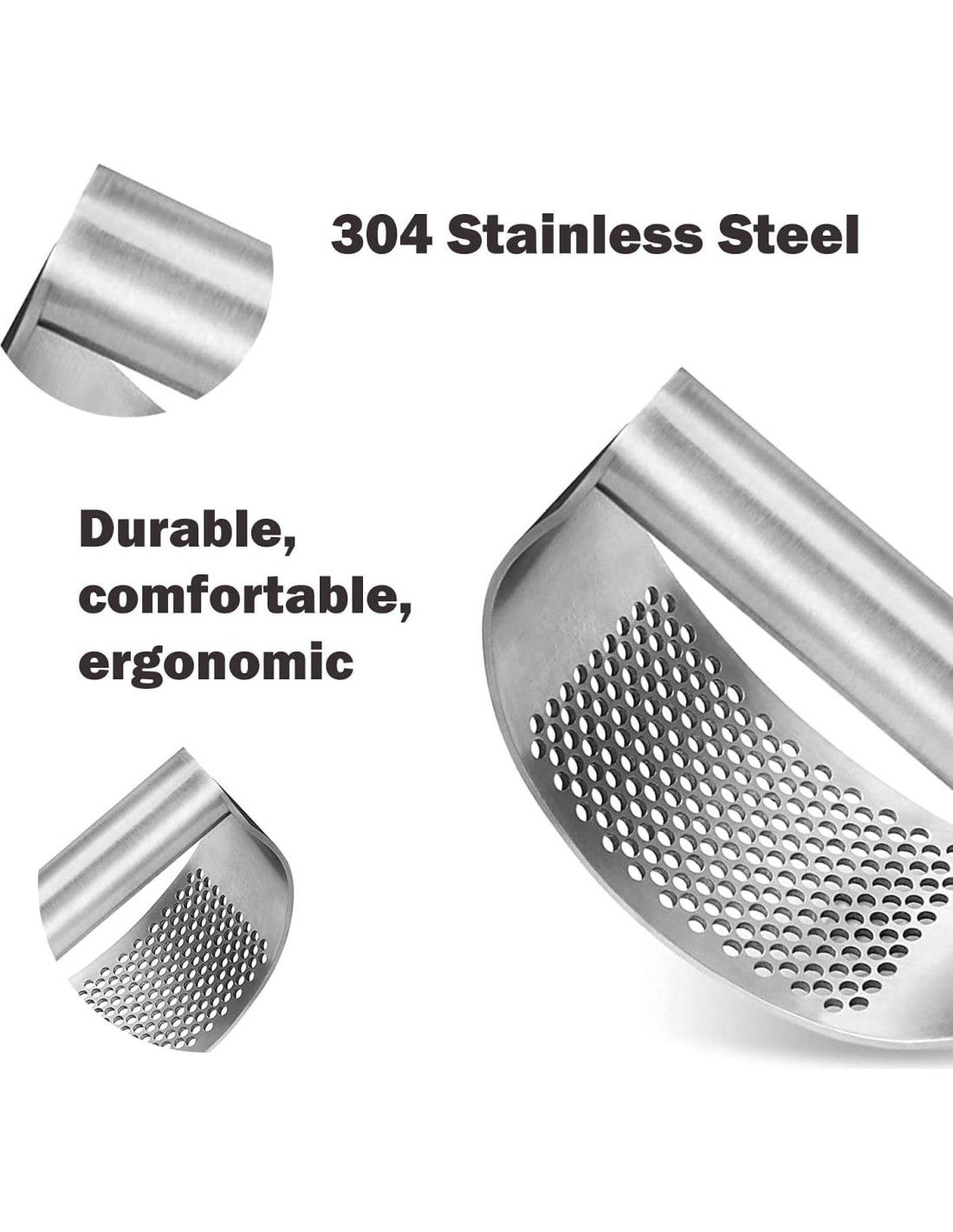 - Diseño Ergonómico del Cortador de Ajo: La prensa de ajo de acero inoxidable con forma de arco y mango ergonómico proporciona un agarre y control fáciles, haciendo que exprimir ajo o jengibre sea más fácil y rápido. Coloca el exprimidor de ajo sobre el diente y con un movimiento de adelante hacia atrás, pica el diente de manera sencilla.