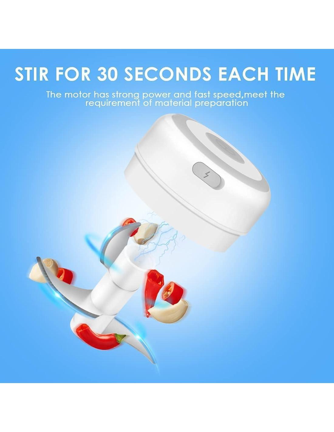 - Componentes incluidos: 1*Picador de Ajo Eléctrico, 1*Manual, 1*Cable de Carga USB