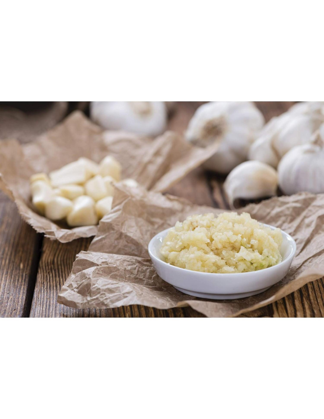 - Aplasta ajo fácilmente sin transferir olores fuertes a las manos; maneja el ajo rápidamente, con o sin la piel removida