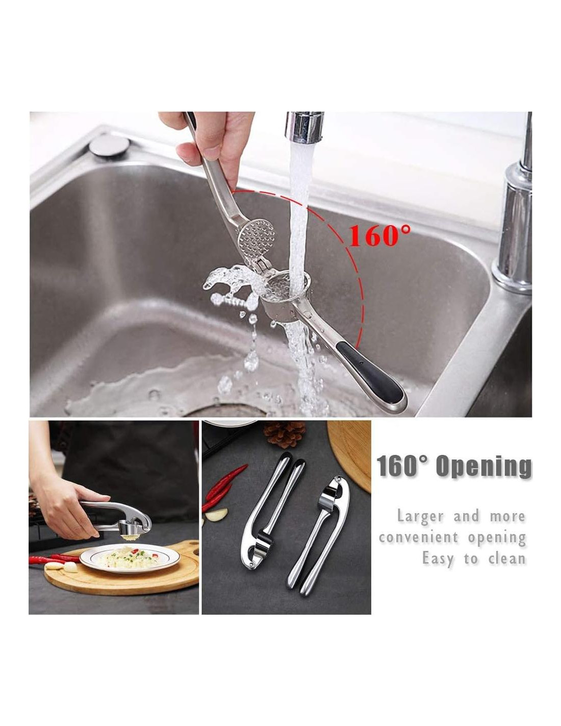 - Multifuncional: Nuestra prensa de ajo no solo se puede usar para triturar puré de ajo, sino también para triturar jengibre, etc., para que puedas usar la prensa de ajo más fácilmente y mejorar la eficiencia. ¿Quieres ajo pelado para rebanar? ¡No hay problema! Usa nuestra prensa de ajo y rebanadora para hacer el trabajo
