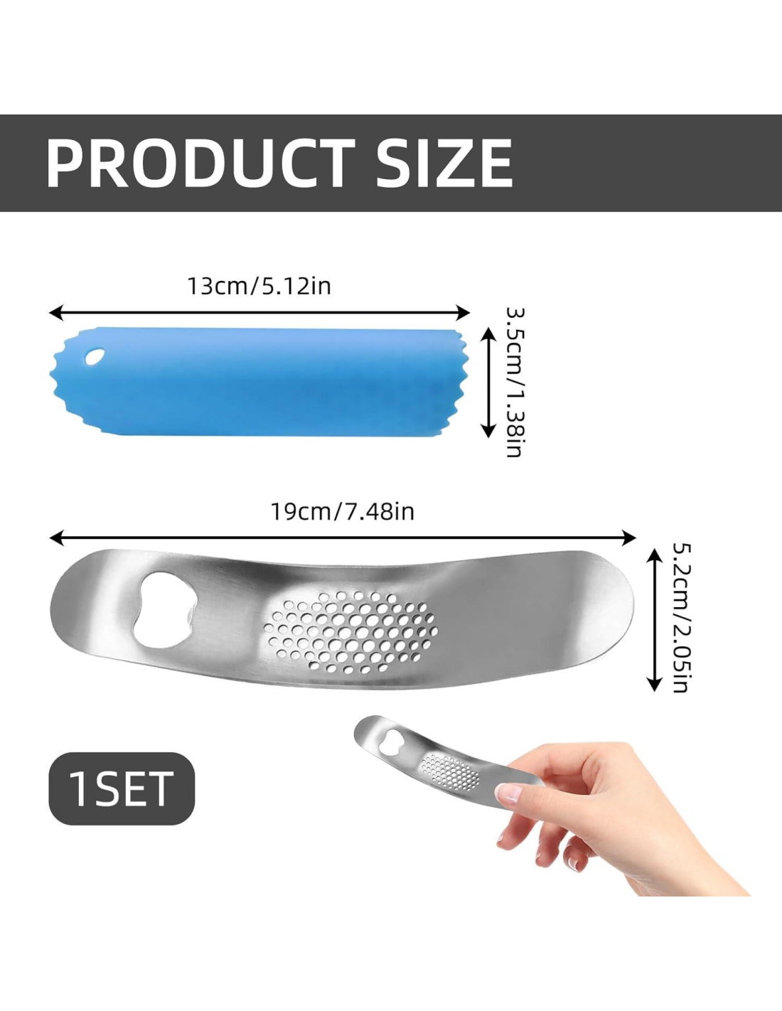 - Preparación de Ajo 2 en 1: Este set incluye una prensa de ajo de acero inoxidable (19.05cm x 4.06cm x 2.54cm, 66g) y un pelador de silicona (12.95cm x 3.56cm, 19g). El diseño curvado y perforado de la prensa tritura el ajo en picadillo de manera eficiente, mientras que el pelador quita las pieles al rodar el ajo por dentro. Ideal para tareas rápidas de pelado y picado.