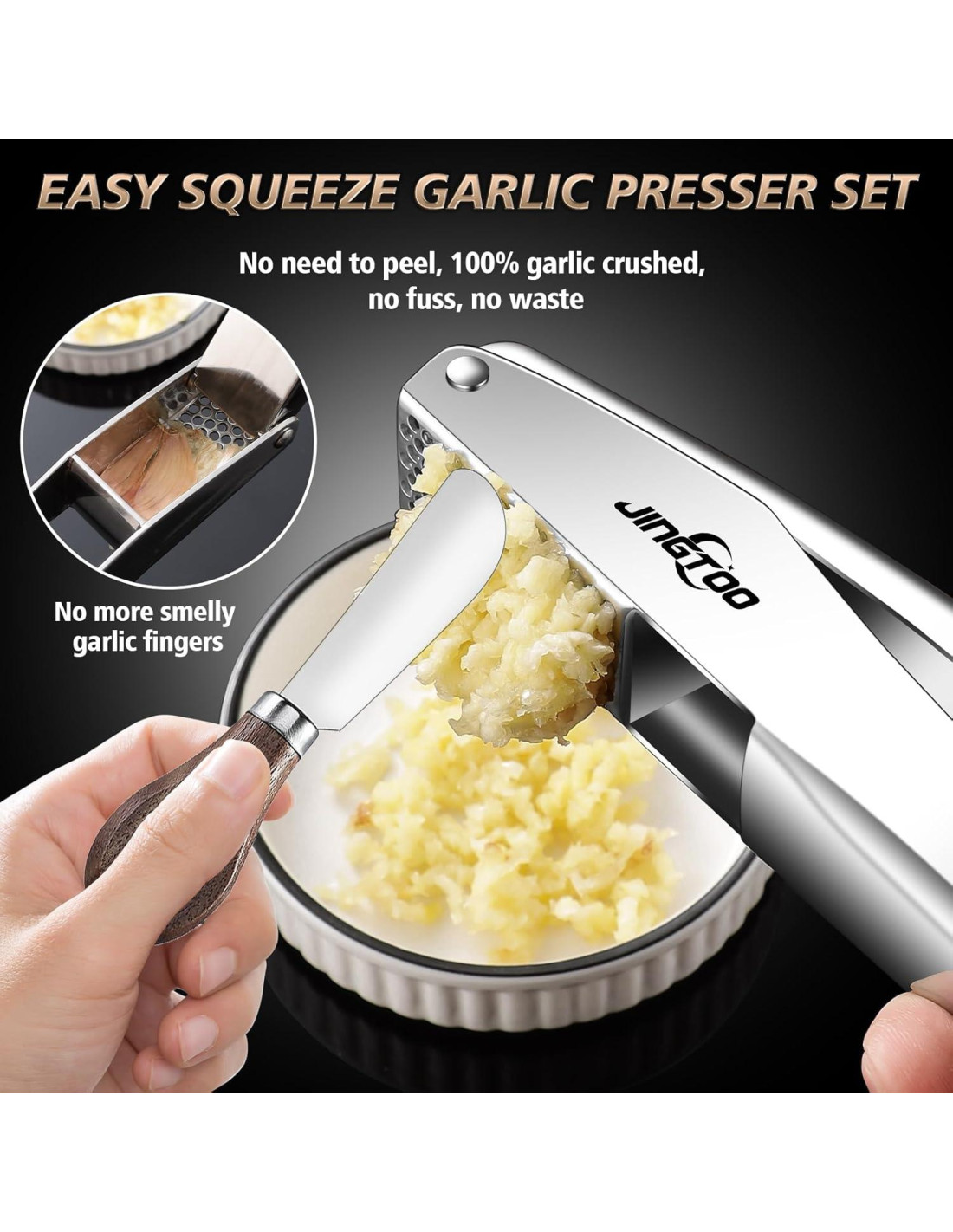 - Juego de Prensa de Ajo de Alta Gama La picadora de ajo contiene 1 trituradora de ajo de acero inoxidable, 1 tubo pelador de ajo, 1 raspador y 1 cepillo. Comparte la alegría de triturar ajo sin esfuerzo con tu ser querido.