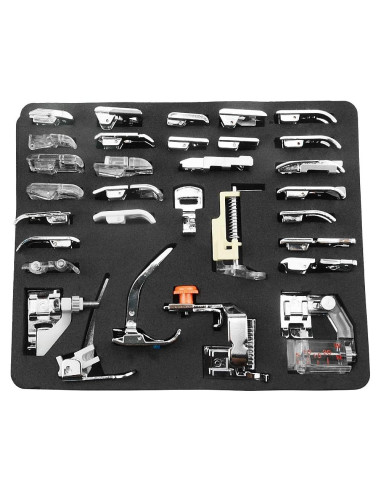 - Contenido del Paquete: Recibirás 32 piezas de pies de prensatelas para máquina de coser, que pueden satisfacer la mayoría de las necesidades en tu trabajo de costura, y cada pie de prensatelas está bien colocado en ranuras específicas, fácil de seleccionar.