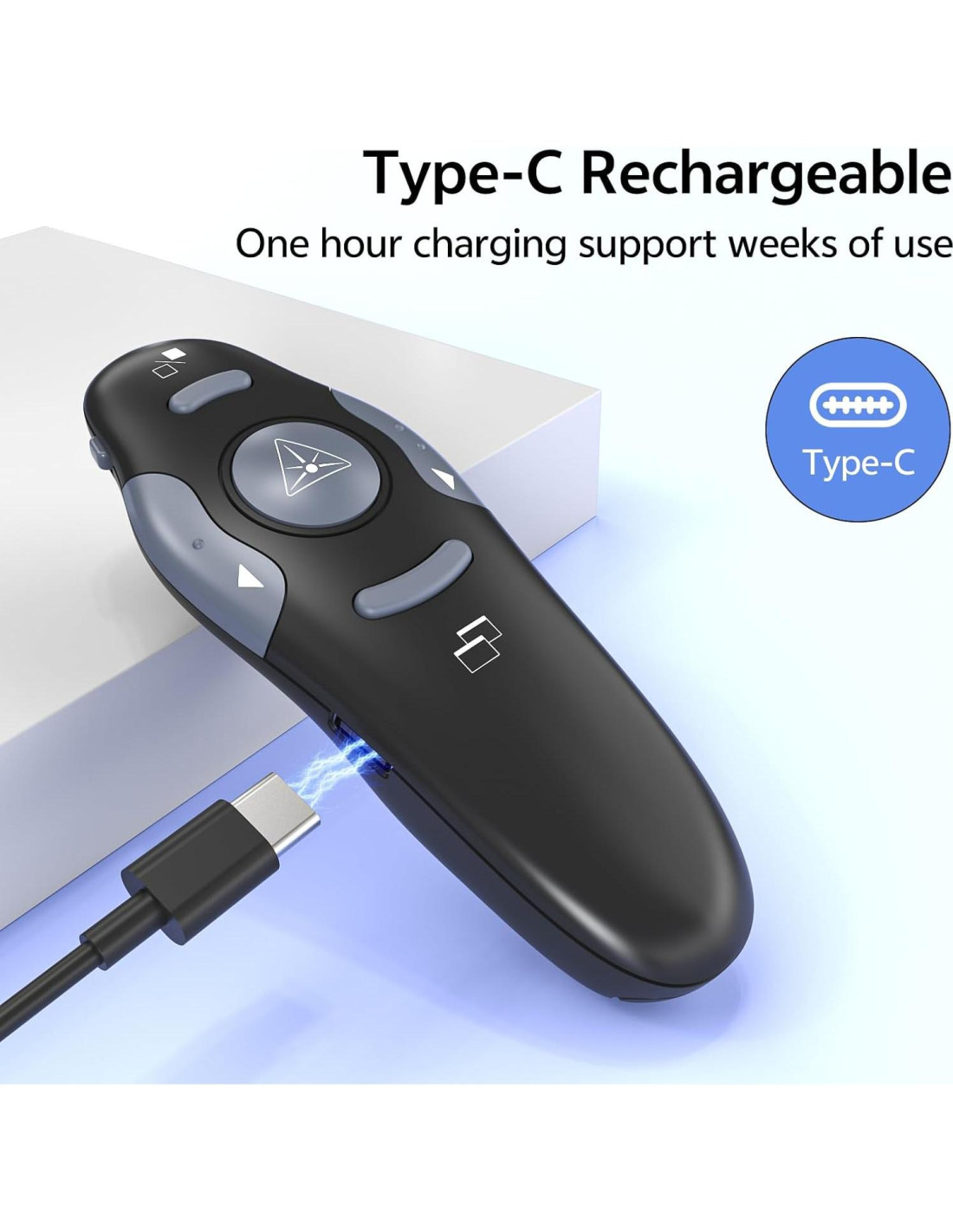 - [Clicker de Presentación Recargable Compacto] El clicker de PowerPoint se puede cargar fácilmente desde su computadora a través del puerto Tipo/USB C, eliminando la necesidad de reemplazos constantes de batería. Solo cargue durante 5 minutos, use durante una hora sin problemas.