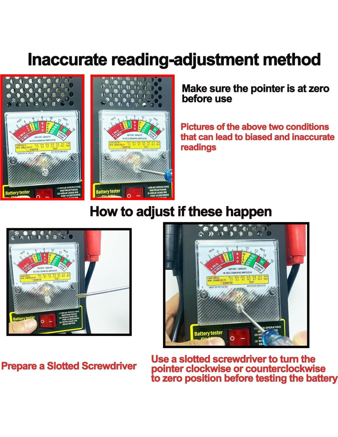 - [Método de Prueba] Conector de clip de cobre con empuñaduras de goma roja positiva y negra negativa, puede sujetar fácilmente los terminales de la batería en la posición de prueba, probar la carga en el interruptor (mantener la carga durante hasta 10 segundos) para consumir corriente de la batería y simular el consumo del motor de arranque, por lo que es preciso y fácil de leer para determinar la condición de la batería.