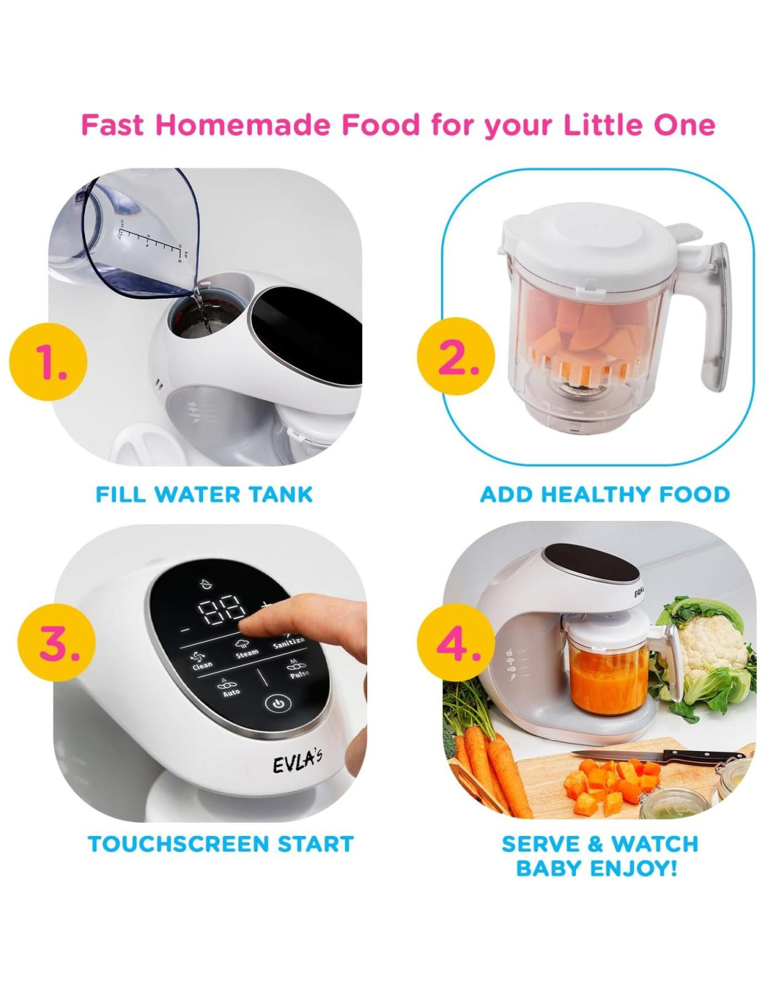 - VAPORERA DE ALIMENTOS PARA BEBÉS, LICUADORA, FABRICANTE DE PURÉ EN UNO: La función de vaporera del procesador de alimentos para bebés EVLA permite cocinar bien los ingredientes antes de licuarlos, preservando su sabor natural, luego hacer puré y mezclar frutas, verduras y carnes en la textura y consistencia deseadas por su bebé.