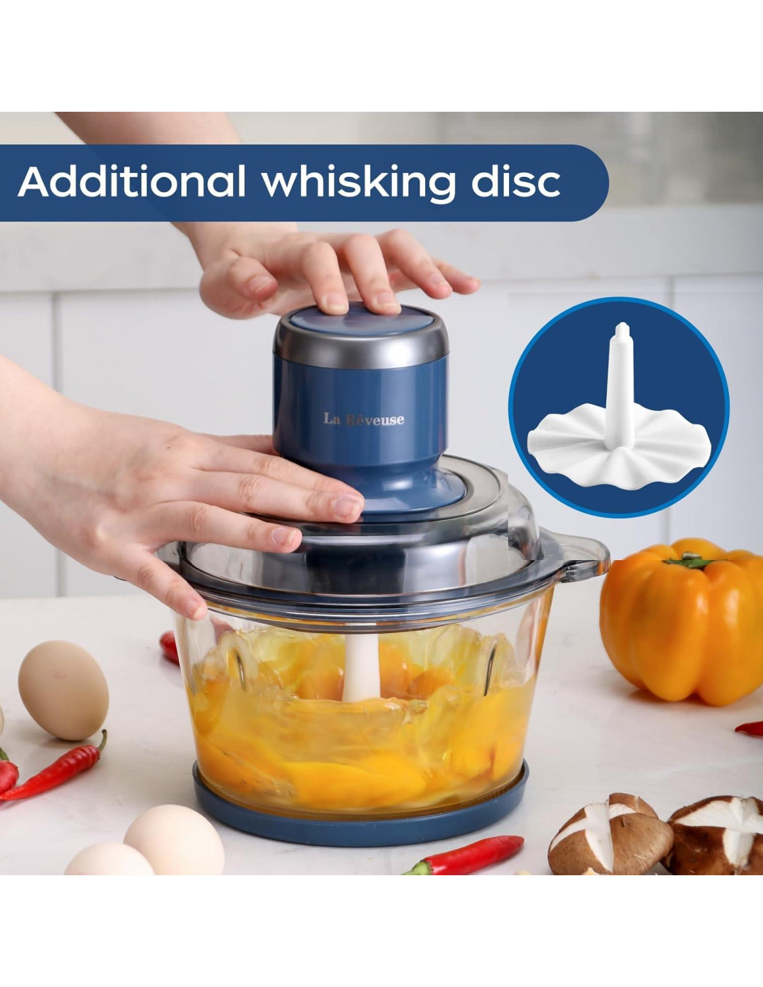 - Fácil de Montar y Limpiar - El tazón de picar es libre de BPA. Estructura completamente desmontable, fácil de montar y limpiar. El procesador de alimentos La Reveuse viene con un pod de potencia de 300W, un tazón de vidrio de 7 tazas, cuchilla de picar de doble nivel, un disco para batir y una espátula