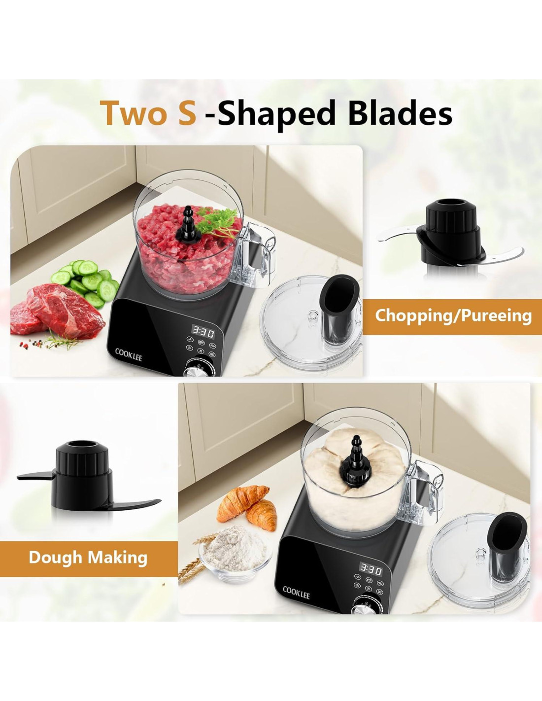 - RENDIMIENTO PODEROSO EN UNA MÁQUINA El Procesador de Alimentos de 12 Tazas COOKLEE combina una licuadora, procesador de alimentos y máquina de masa en un electrodoméstico versátil. Alimentado por un motor de 600 vatios, maneja ingredientes difíciles sin esfuerzo, ofreciendo resultados suaves y consistentes cada vez.