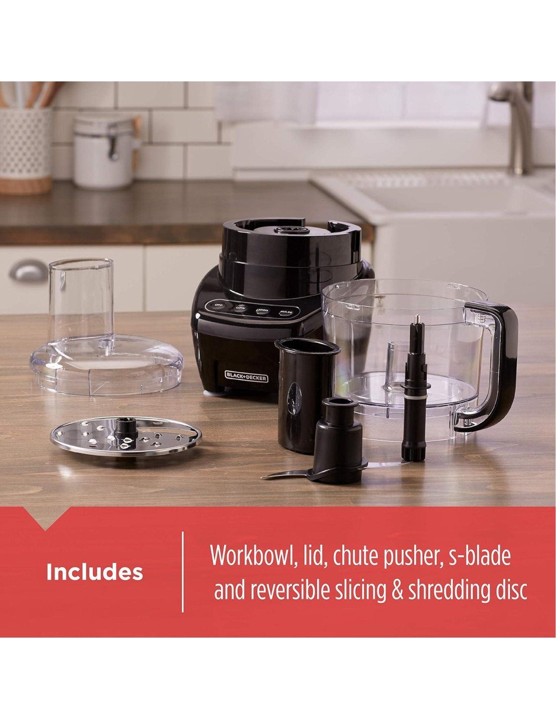 Solo configura y listo para picar, rallar, cortar y más. El Procesador de Alimentos de 8 Tazas de BLACK+DECKER de Fácil Montaje está diseñado para la conveniencia, solo coloca el tazón de trabajo sobre la base y gira la tapa hasta que se bloquee en su lugar. La cuchilla en S es perfecta para picar y mezclar, y el disco de doble cara ofrece un fácil corte y rallado. Elige entre dos velocidades y una configuración de pulso para alcanzar resultados óptimos para todo tipo de alimentos. El tazón de trabajo de 8 tazas acomoda grandes cantidades, y todas las partes removibles son aptas para lavavajillas, por lo que la limpieza es rápida y fácil.