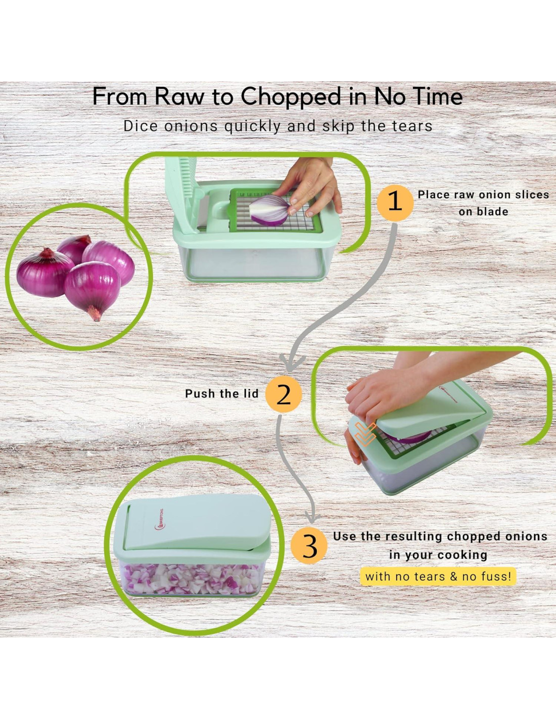 - CAPACIDAD DEL CONTENEDOR DOBLE, DOBLE LA COMODIDAD: No dejes que un contenedor pequeño ralentice tu picado. Aumentamos el tamaño de nuestro contenedor en un 200% en comparación con otros picadores en el mercado, permitiéndote picar un 200% más, todo de una vez. Úsalo como un cortador de cebolla (sin lágrimas), o como un cortador de alimentos general para preparar una amplia variedad de verduras y frutas, por ejemplo, champiñones, tomates, pepinos, calabacines, pimientos, rábanos, papas, kiwis, manzanas, melones, plátanos, peras, fresas, etc. en la mitad del tiempo habitual.