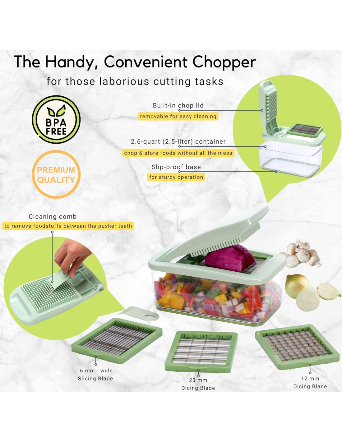 - DISEÑADO PARA UN TRABAJO DE PICADO / CORTADO EN DADOS / REBANADO PERFECTO: 3 cuchillas te permiten picar, cortar en dados y rebanar verduras con facilidad. La tapa de corte incorporada te permite cortar alimentos directamente en el contenedor de 2.6 cuartos sin el desorden de un cuchillo y una tabla de cortar. Este picador de verduras reducirá tu tiempo de preparación a solo unos minutos. Perfecto para hacer dados y rebanadas consistentes y uniformes de tus verduras y frutas favoritas para ensaladas, salteados, sopas, crudités, ragú, guisos, postres. Libre de BPA, PVC y ftalatos.