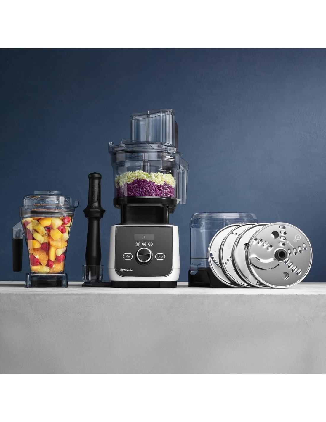 - Componentes incluidos: Base del Motor X4, Contenedor de 48 onzas (1.42 litros), Tamper, Soporte para Tamper, Libro de Recetas, Base de Procesador de Alimentos DETECCIÓN AUTOMÁTICA, Tazón de Trabajo de 12 Tazas, Tapa del Tazón de Trabajo, Cuchilla Multiusos, 2 Discos Reversibles para Rebanar/Rallar, 1 Disco Juliana, 1 Disco para Palitos de Verdura, Estuche de Almacenamiento de Discos con Extensor, 2 Empujadores de Alimentos