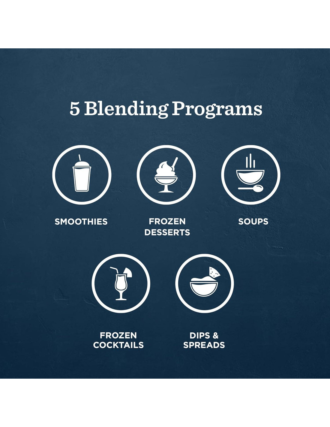 - 5 Programas de Mezcla: Programas de Smoothie, Sopa Caliente, Postre Congelado, Dips y Untar, y Cócteles Congelados para conveniencia y resultados consistentes.