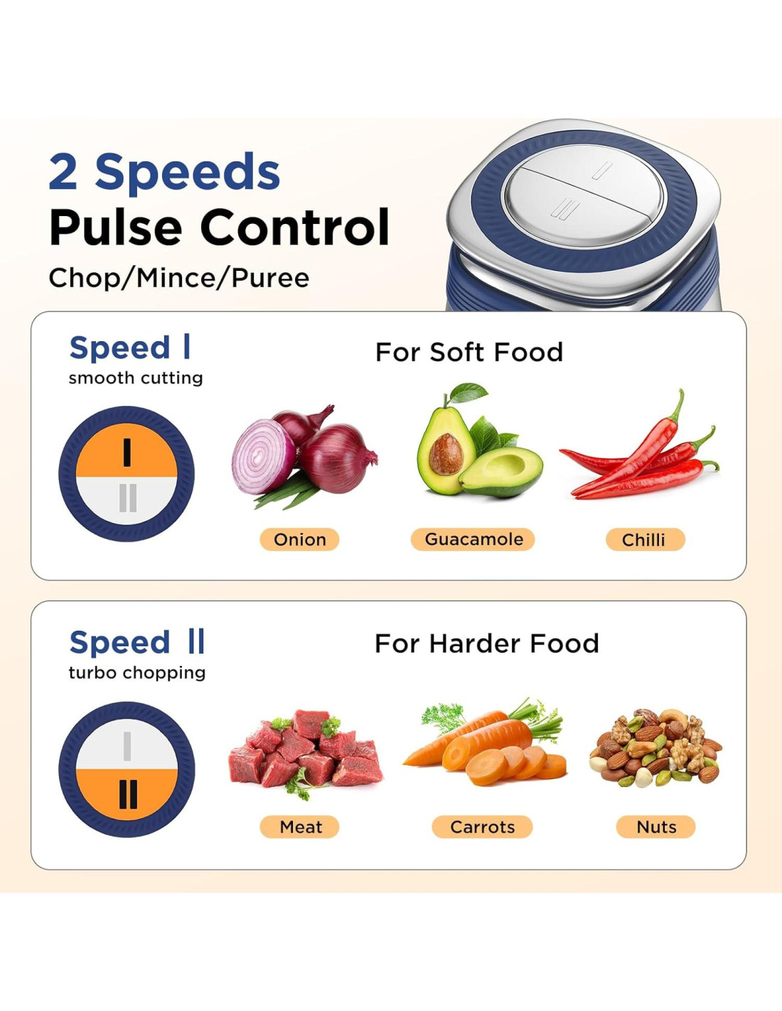 - Picado--Dos modos de velocidad son adecuados para diferentes tipos y cantidades de ingredientes que satisfacen una variedad de necesidades culinarias. Mantener presionado para un zumbido constante o simplemente presionar para pulsar o hacer puré proporciona un control definitivo.