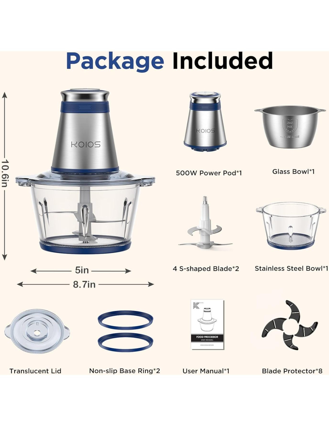 - Componentes incluidos: Tazones de 8 Tazas, Tapa, Motor de 500W, Tazón, Cuchilla en S