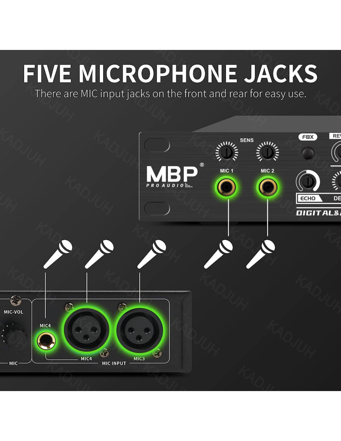 - [Soporte para Entrada de Micrófono] Panel frontal 2 vías R+L OUT 1/4" (6.35mm) / panel trasero 2 vías XLR micrófono + 1 vía interfaz de entrada de 6.35mm, soporte para ajuste de volumen de micrófono / ajuste de graves / ajuste de agudos. Tiene una función de ajuste de ecualización de parámetros de seis bandas, que tiene un rango de ajuste más amplio, y el sonido es más delicado y suave sin dañar el tono original. El canal bajo está equipado con un circuito completo de prevención de auto-excitación de baja frecuencia.