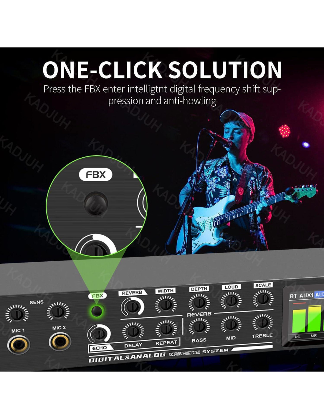 - [Efecto de Reverberación Pre-etapa KTV de Metal Completo] Nueva actualización del mezclador digital anti-howling reverberador con diseño de pantalla LCD (Puede mostrar la letra). Chip inteligente de efecto incorporado, perilla sensible y carcasa de metal. Hay modos de canal de graves, canal central, canal izquierdo y canal derecho, dándote una sensación estéreo completa. Ampliamente utilizado en: bodas, conciertos, bares, reuniones de negocios, eventos empresariales, karaoke, entretenimiento familiar, actuaciones al aire libre y otras ocasiones.
