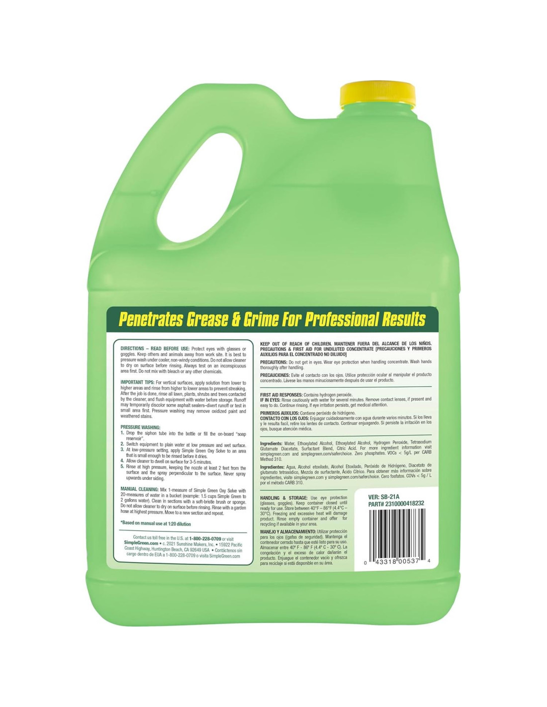 1) Sumerge el tubo de sifón en la botella o llena el depósito de jabón. 2) Humedece tu superficie con agua corriente a baja presión. 3) Aplica Oxy Solve en una configuración de baja presión. 4) Deja que el limpiador actúe durante 3-5 minutos, luego enjuaga a alta presión. 1) Mezcla 1 parte de Oxy Solve con 20 partes de agua en un balde. 2) Humedece la superficie y frota con un cepillo de cerdas suaves o esponja. 3) Enjuaga con una manguera de jardín a alta presión. Creamos Compact by Design para identificar productos que, aunque no siempre pueden parecer muy diferentes, tienen un diseño más eficiente. Con la eliminación de aire y agua en exceso, los productos requieren menos embalaje y se vuelven más eficientes para enviar. A gran escala, estas pequeñas diferencias en el tamaño y peso del producto conducen a reducciones significativas en las emisiones de carbono.