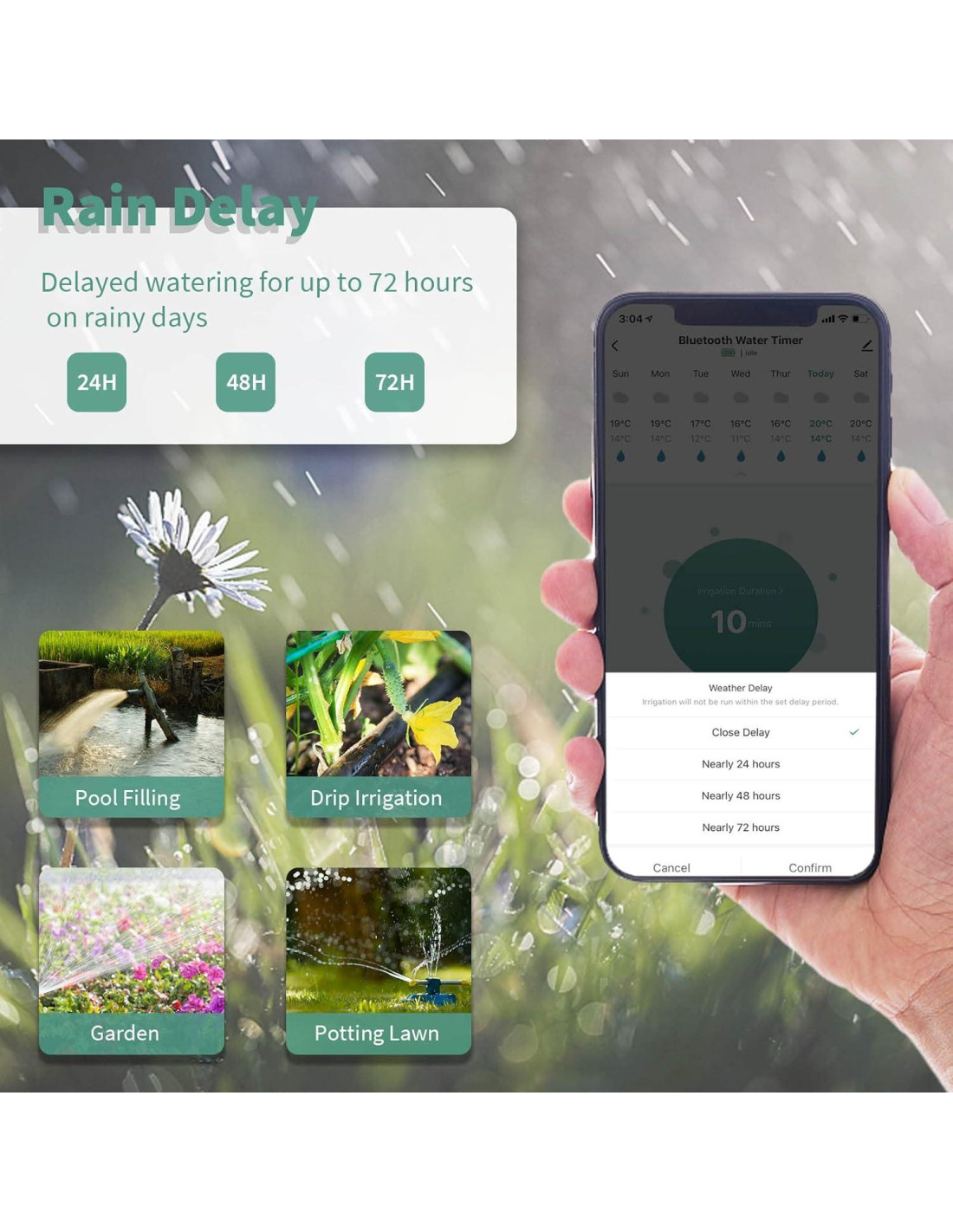 - Retraso por Lluvia y Riego Manual: Este temporizador de manguera de agua cuenta con una función de retraso por lluvia que se puede configurar para omitir el riego durante 24h, 48h o 72h, así como un modo manual que permite aún más flexibilidad en el programa de riego