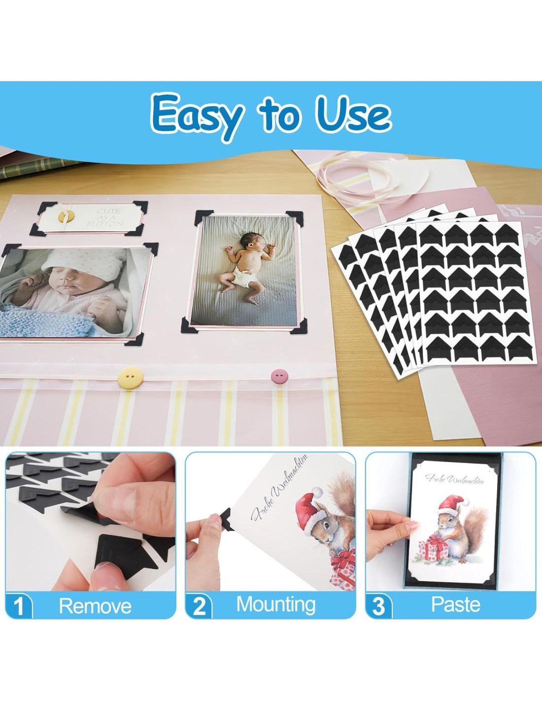 - Fácil de Usar: Las esquinas de fotos para scrapbooking son extremadamente fáciles de usar, los usuarios solo necesitan pegarlas en las cuatro posiciones de las esquinas de la foto, y luego insertar la foto en las esquinas de la imagen para lograr una exhibición sólida de la foto