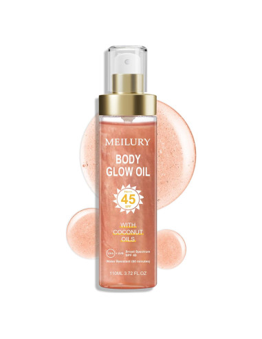 - [SPF 45 DE AMPLIO ESPECTRO] Con protección SPF 45 y PA+++, el aceite corporal SPF de Meilury proporciona un escudo UVA/UVB inigualable para proteger tu piel de los dañinos rayos solares y el fotoenvejecimiento.