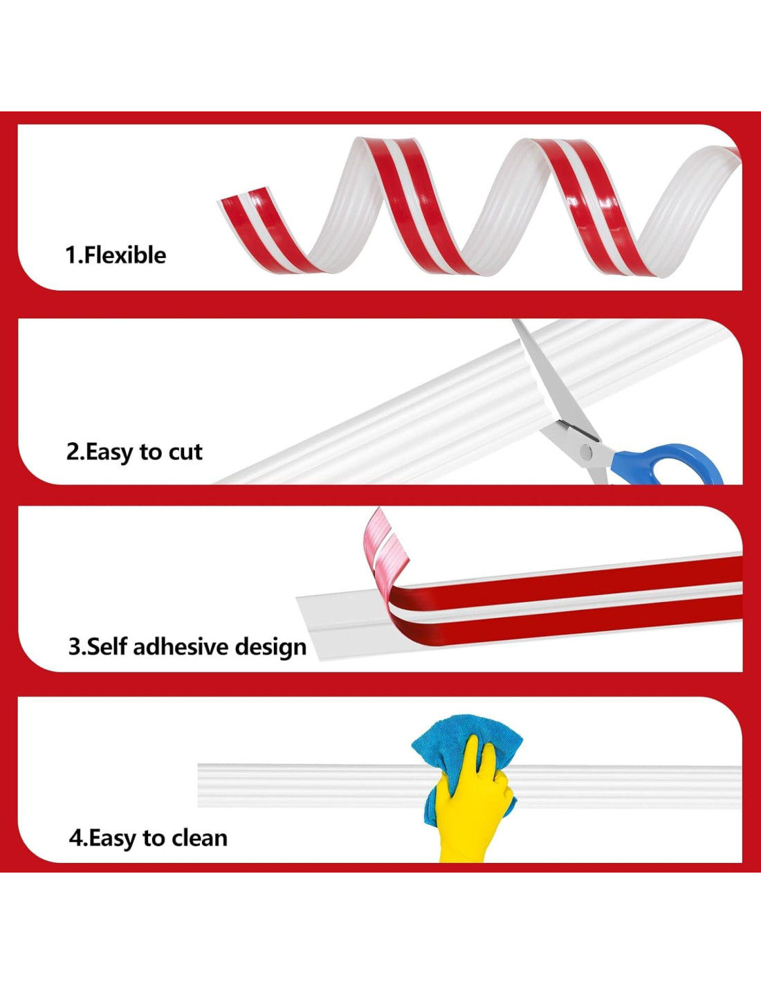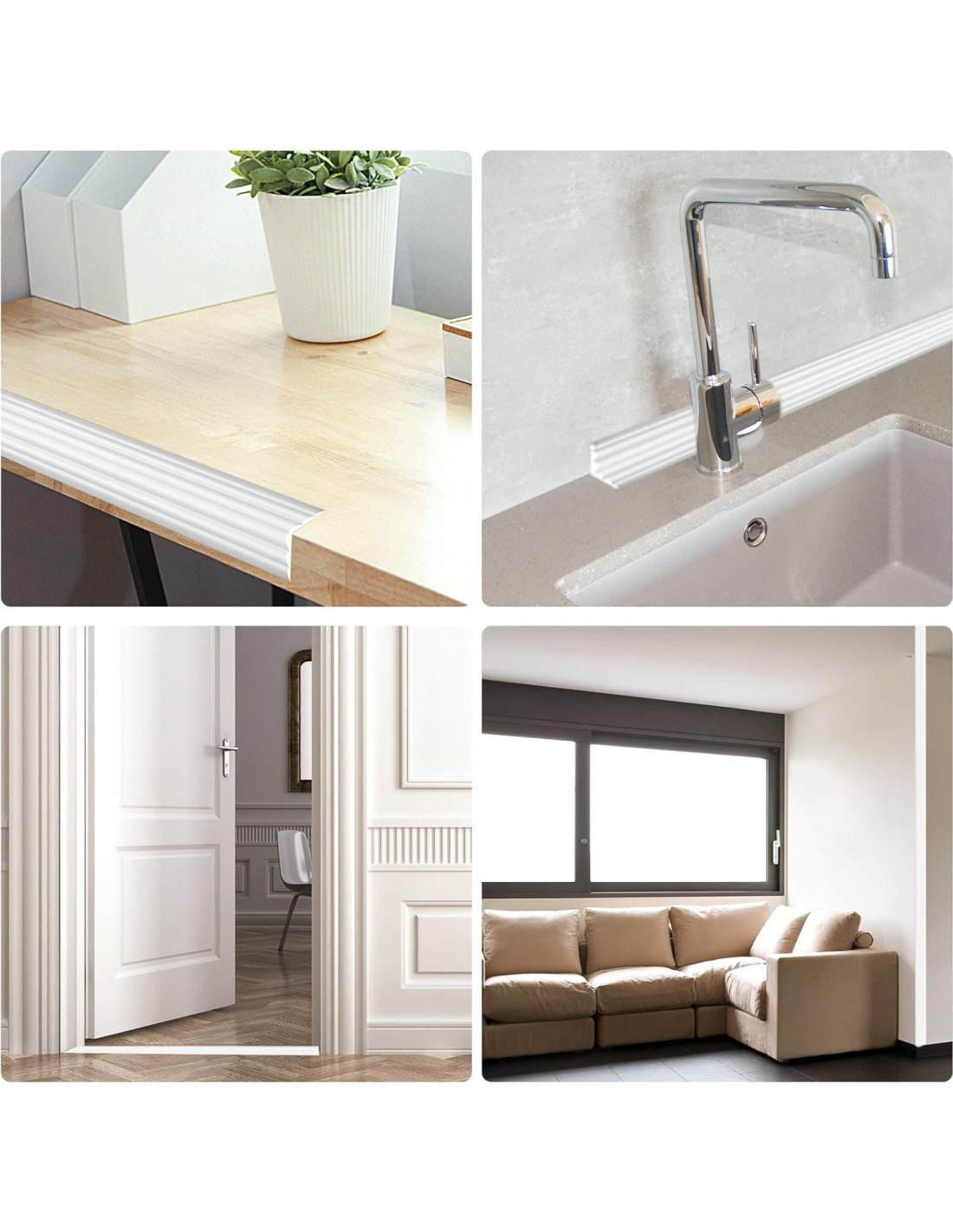 - MÚLTIPLES APLICACIONES Nuestra moldura de esquina puede adherirse a casi cualquier superficie de esquina (azulejo, plástico, mármol, metal, vidrio, madera, paredes lisas, etc.), lo que la hace perfecta para baños, dormitorios, salas de estar, cocinas, oficinas, inodoros, casas rodantes, salpicaderos, paredes de fondo de TV, molduras de corona, zócalos, techos, marcos, gabinetes, espejos y más.