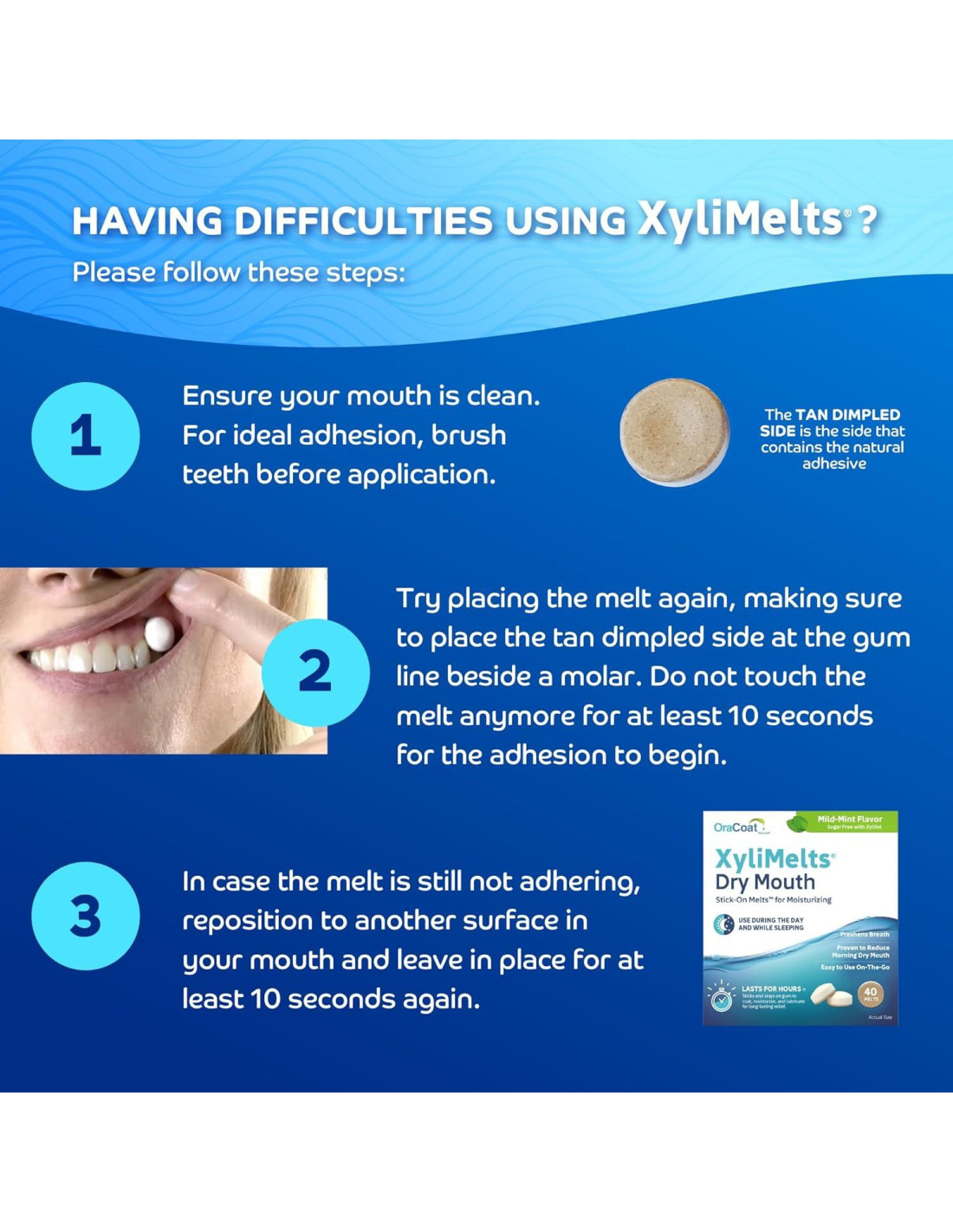 - NATURALMENTE SIN AZÚCAR: XyliMelts incorporan xilitol, un ingrediente clave en productos para boca seca que mejora el flujo de saliva para un cuidado efectivo del mal aliento para adultos mientras permanece sin azúcar