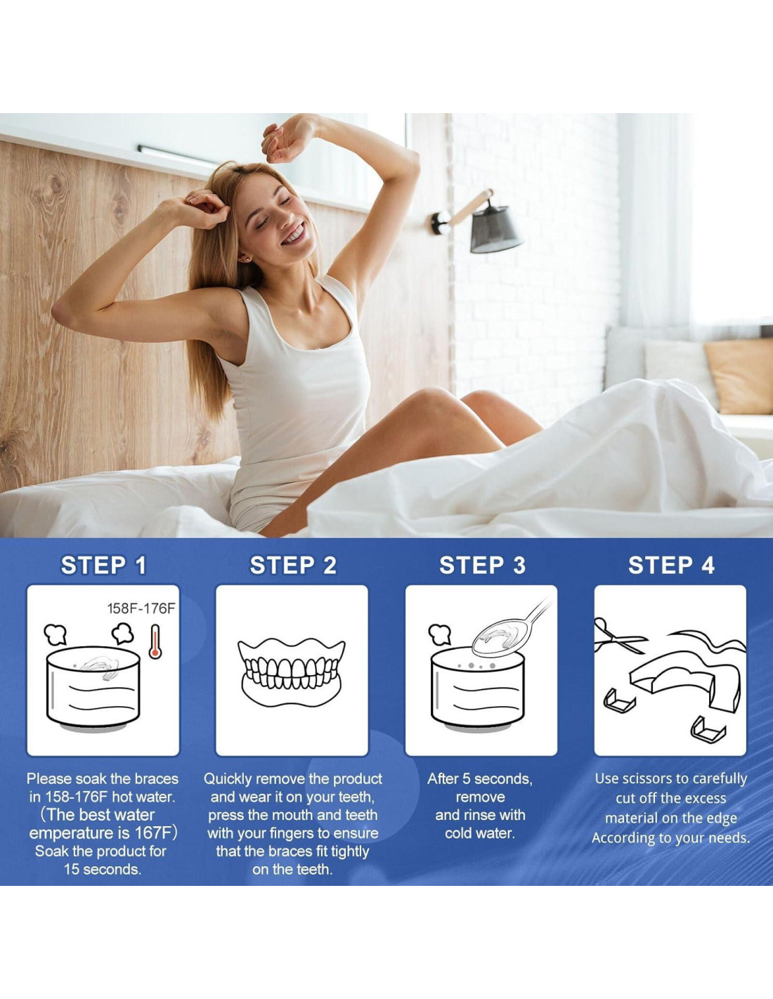 - Uso Conveniente y Personalización Rápida: Simplemente suaviza el producto en agua a una temperatura especificada (70-80C) durante 15 segundos, luego dale forma mordiendo. Puedes obtener fácilmente un protector bucal que se ajuste a la forma de tus dientes. (Consulta el manual del usuario para instrucciones detalladas).