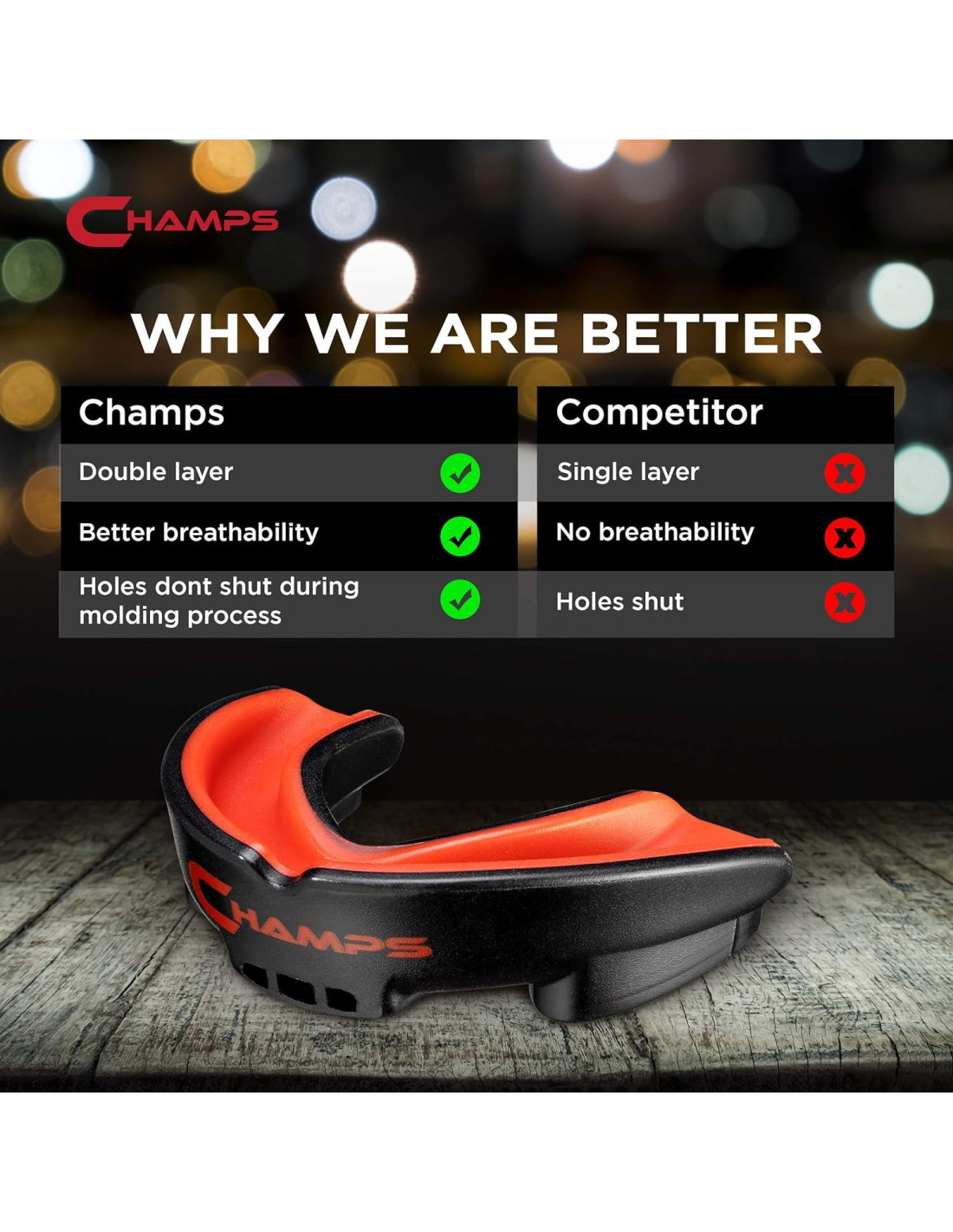 - SE AJUSTA COMO UN GUANTE DE BOXEO - El equipo de MMA mal ajustado puede dejarte en pedazos. Maximiza la protección Y la comodidad con tu protector bucal Champs MMA con diseño de boxeo que cuenta con gel de próxima generación que se adapta a ti.