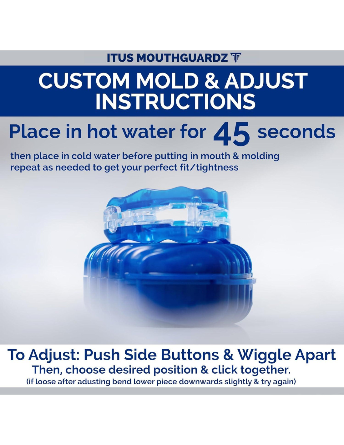 - IMPORTANTE NOTA de ITUS MOUTHGUARDZ: MOLDEAR antes de hacer ajustes. Por favor, MANTEN EL PROTECTOR BUCAL EN AGUA CALIENTE durante 45 segundos completos. Asegúrate de MORDER FIRME. Si el protector bucal antisnore está suelto, repite. Contáctanos si tienes algún problema o pregunta.
