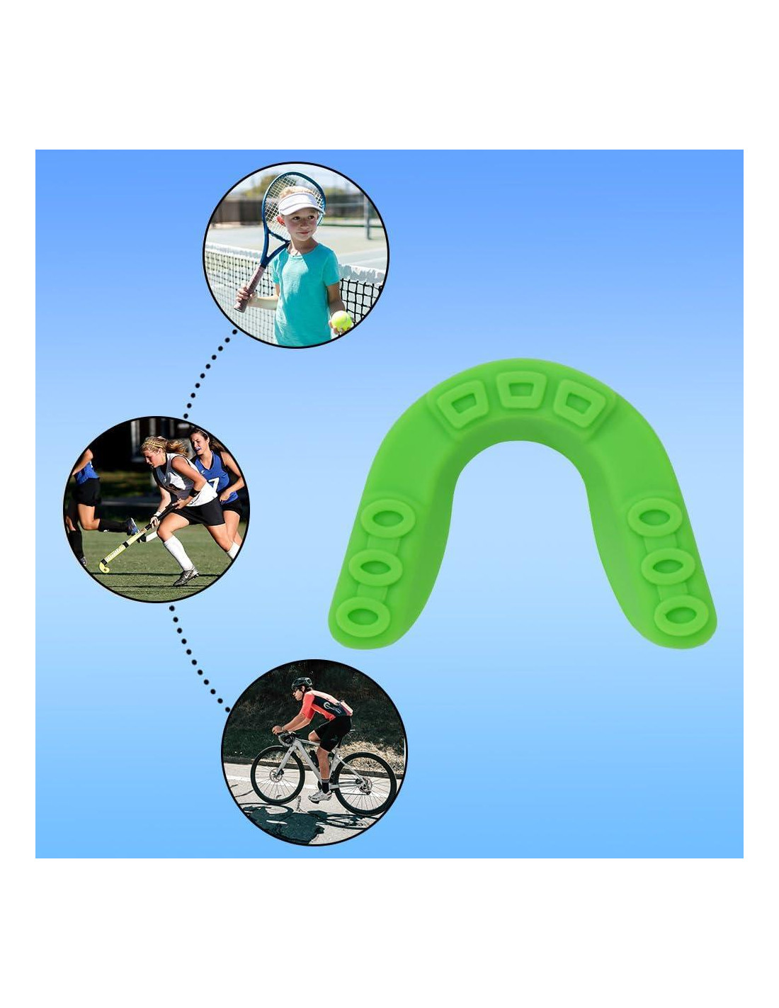 - Amplia aplicabilidad: Este protector bucal deportivo se puede aplicar a muchas actividades deportivas, como baloncesto, fútbol, voleibol, patinaje sobre hielo, boxeo, béisbol, artes marciales, etc.