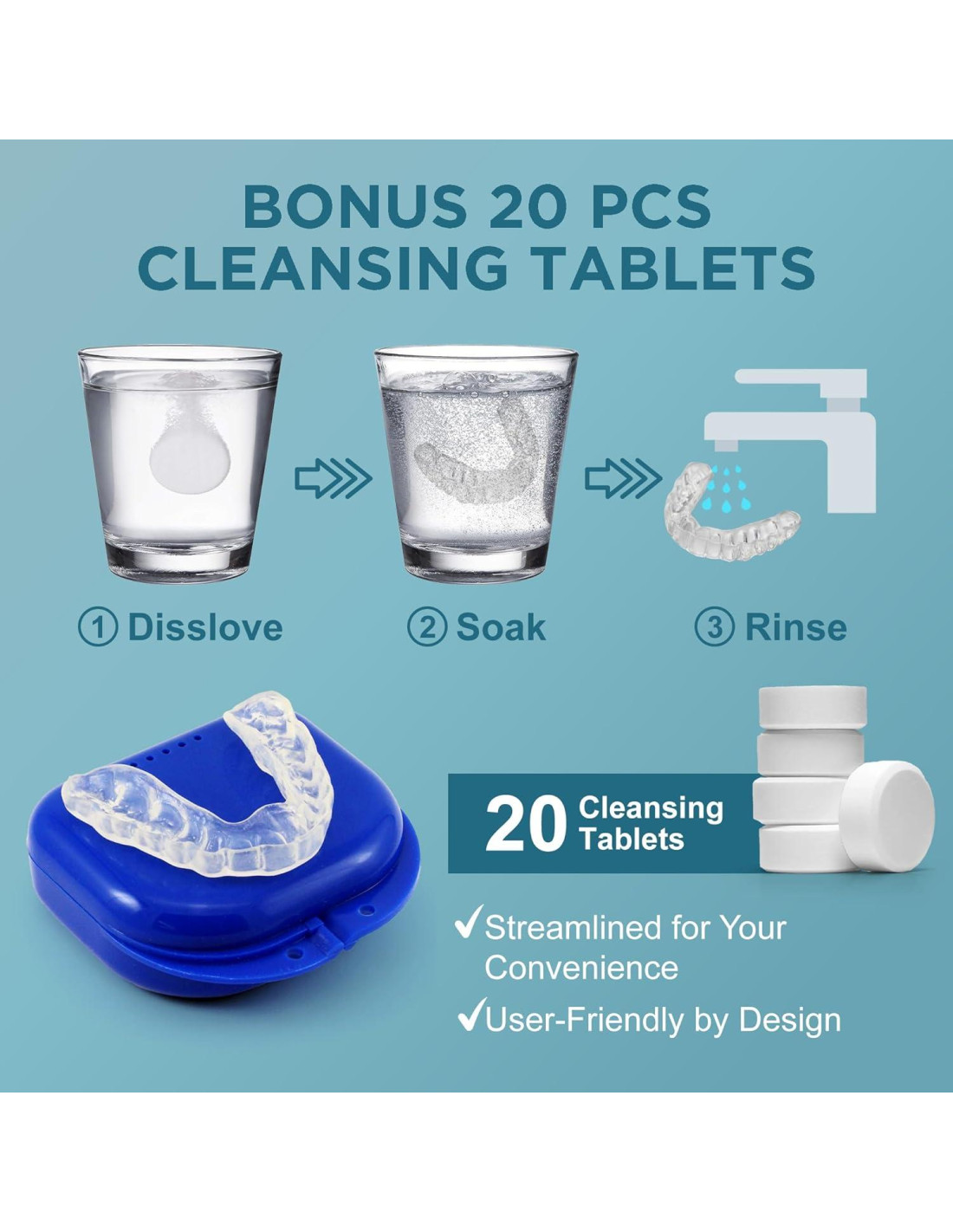 - Tabletas de Limpieza de Bonificación: Mantén tu protector bucal fresco e higiénico con nuestras 20 tabletas de limpieza incluidas. Simplemente disuélvelas en agua para asegurar un protector limpio y fresco cada vez. La limpieza regular ayuda a mantener la integridad y seguridad de tu protector bucal para un uso prolongado.