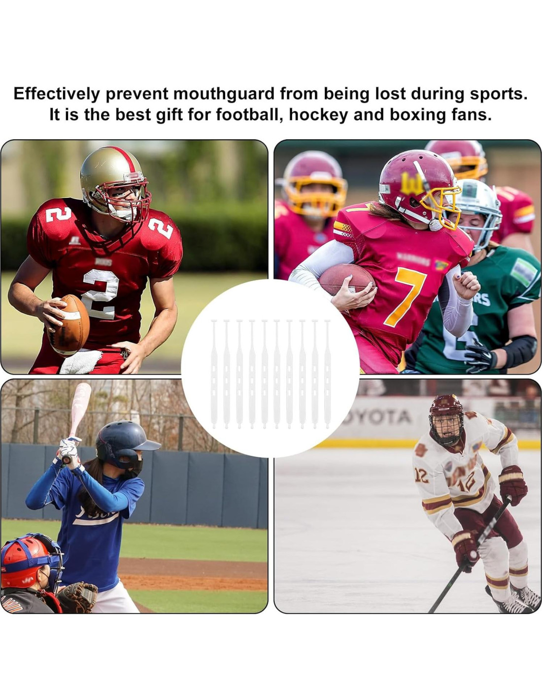 - Fácil de instalar: Nuestra correa para protector bucal de rugby es muy fácil de instalar. Simplemente inserta un extremo en el agujero del protector bucal, ata el otro extremo al casco y presiona firmemente. No se necesita ninguna otra herramienta, y es conveniente para entusiastas del deporte o principiantes.