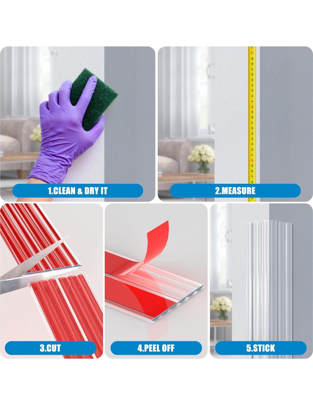 - Fácil de Cortar: Nuestros protectores de esquina vienen en múltiples tamaños para selección: opciones de longitud: 3ft/4ft/5ft/6ft, ancho: 1.18 pulgadas. Son fáciles de cortar y adaptar, satisfaciendo diversas necesidades. Además, son pintables y discretos, integrándose suavemente con las paredes. Mientras tanto, nuestros protectores de borde transparentes tienen una superficie de limpieza sin complicaciones: simplemente limpie con un paño húmedo o esponja.