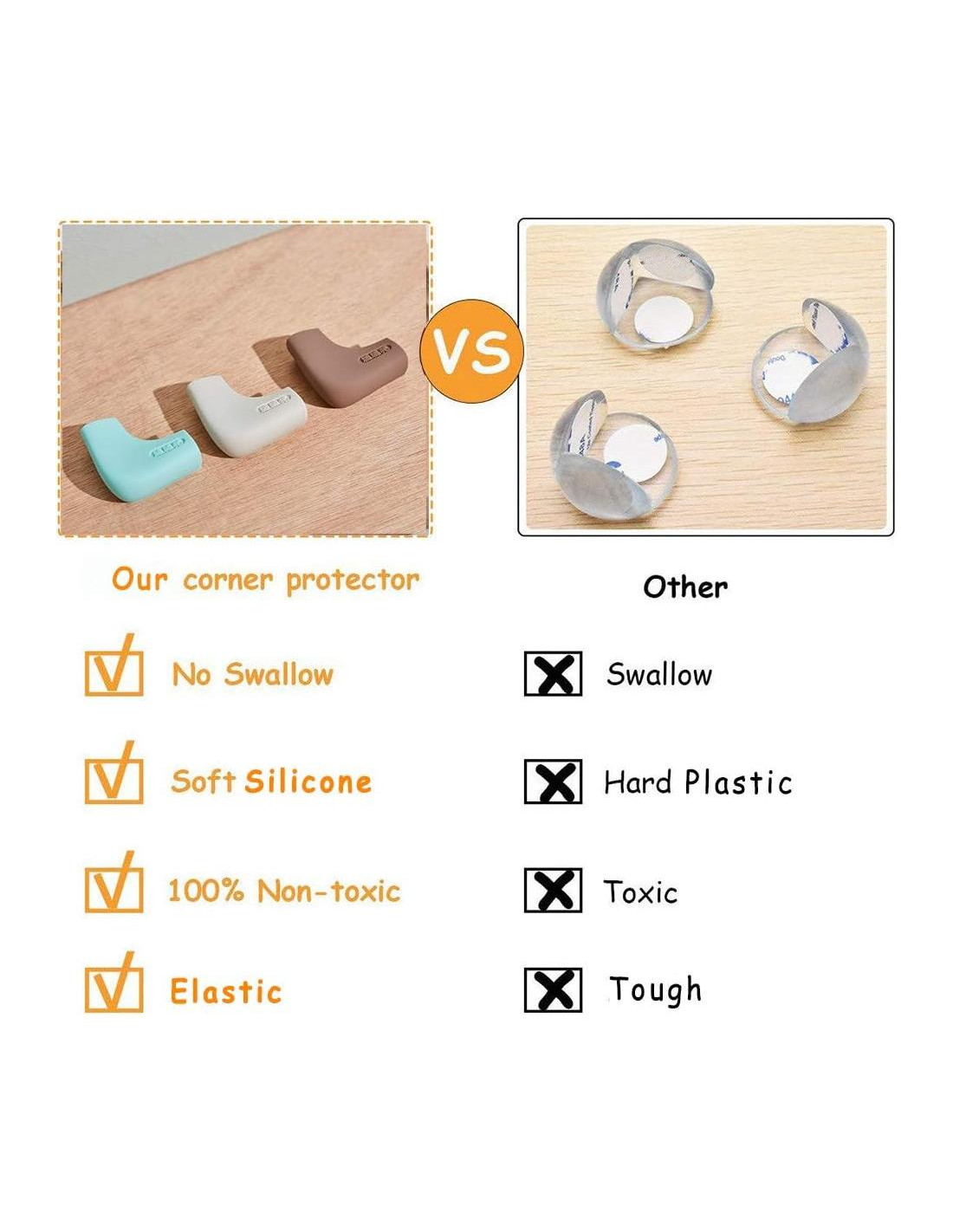 - Material de Silicona Aprobado para Alimentos Hecho de Silicona suave resistente a altas temperaturas (excepto el adhesivo), ofrece 5 veces más acolchado, más suave y más grueso que los protectores de esquina de PVC normales. A diferencia del material de espuma, no puede ser desgarrado fácilmente por bebés y niños, pero también proporciona una protección flexible para la seguridad del bebé.
