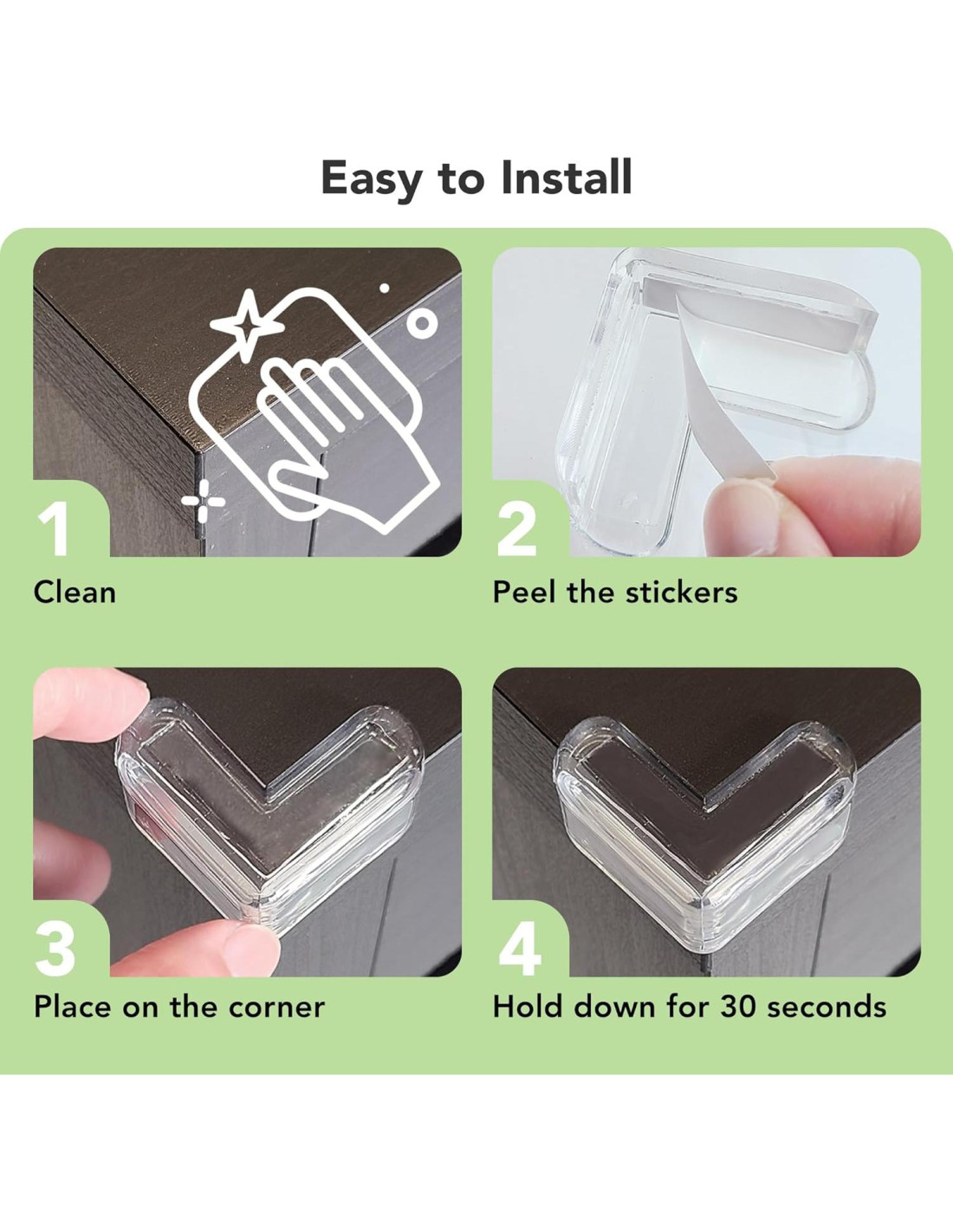 - Adhesivo fuerte. Los protectores de esquinas utilizan cinta acrílica, con una adhesión más fuerte que antes después de nuestras pruebas, no se despegan fácilmente. El protector de esquinas a prueba de bebés incluye adhesivos pre-aplicados directamente, lo que te ayudará a ahorrar mucho más tiempo y no se despega fácilmente.