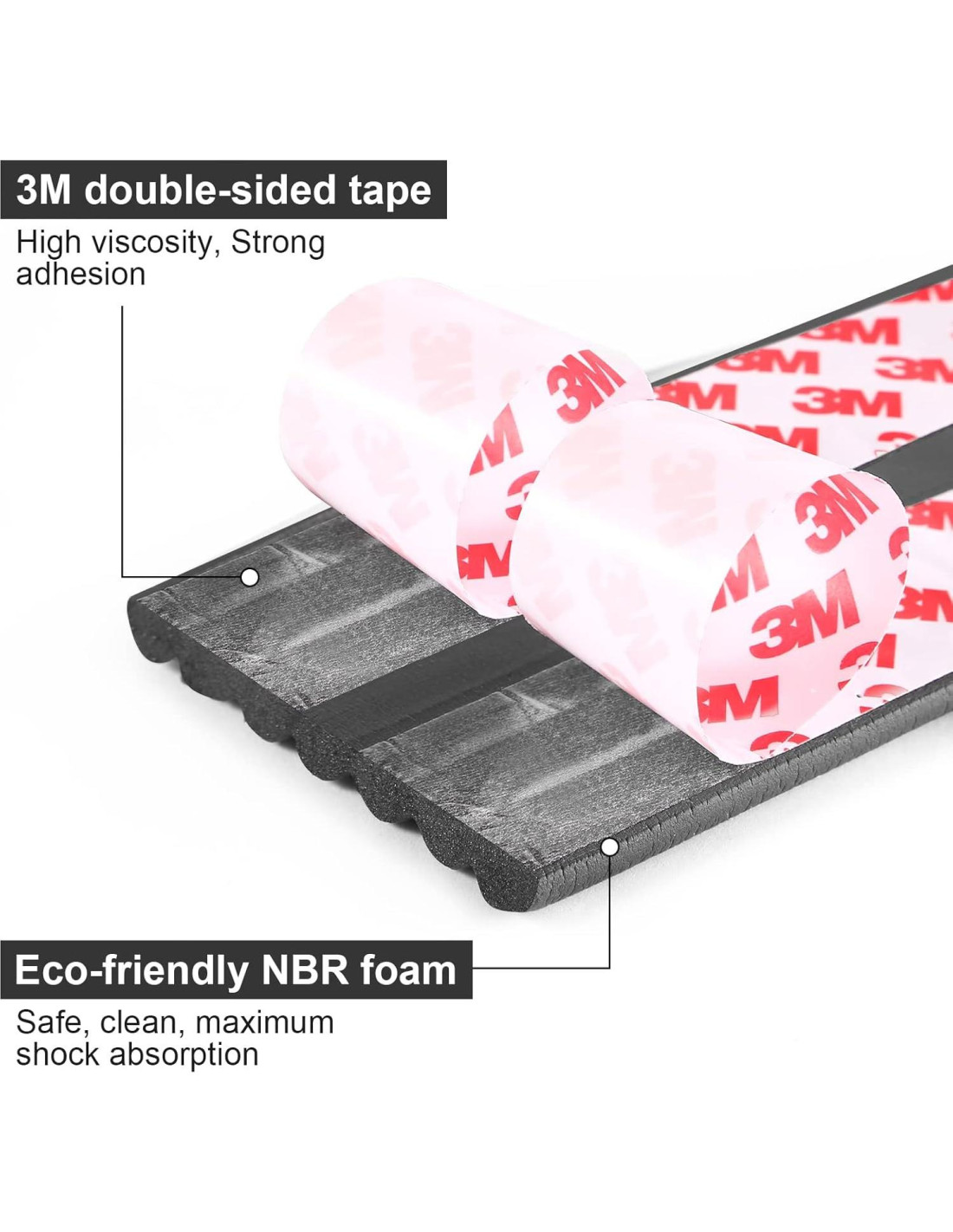 - Material: Espuma NBR de alta densidad premium con cinta adhesiva de alta calidad. Este protector de bordes es suave y maleable. Tamaño: 4.88 m * 7.87 cm * 0.76 cm.