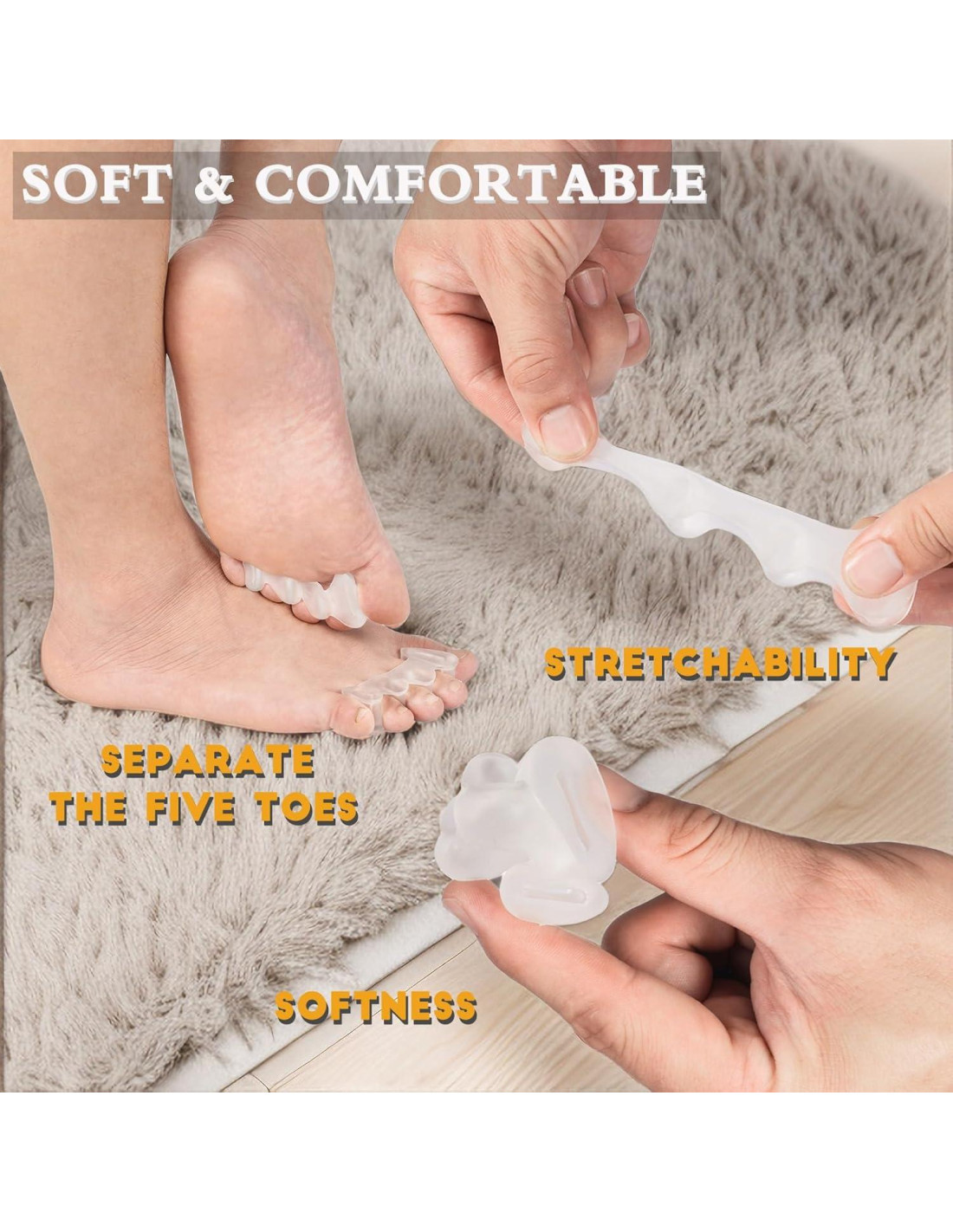 - Alivio del Dolor en los Pies: El separador de dedos puede separar cinco dedos y sentirse relajado, aliviar los juanetes y relajar los músculos. Los dilatadores pueden aliviar la incomodidad por fricción y prevenir callos, ampollas, uñas encarnadas, dedos torcidos y deformaciones adicionales. Nuestro corrector de juanetes se puede usar día y noche para un alivio continuo del dolor en los dedos.