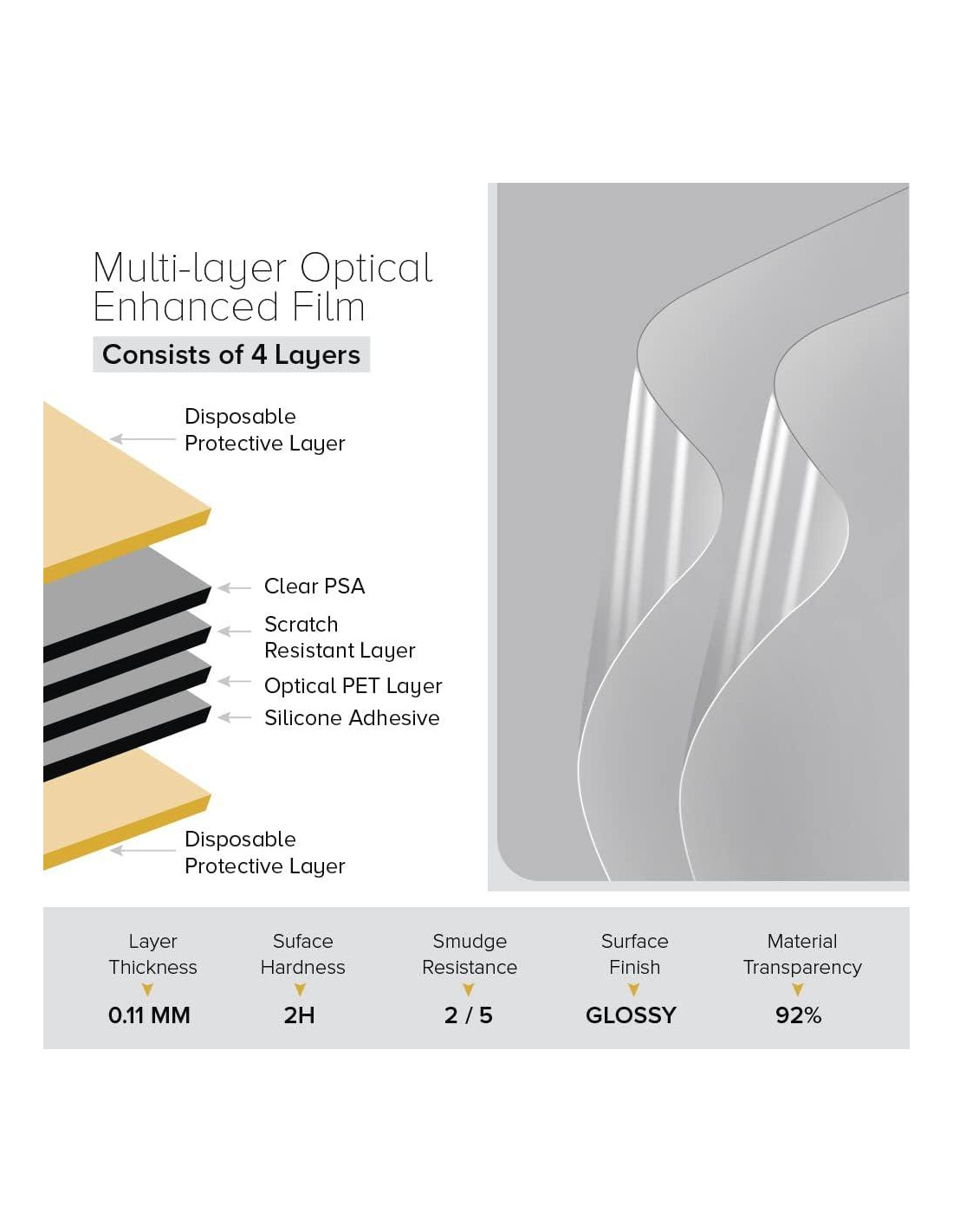 - Claridad óptica cristalina se adhiere firmemente y con facilidad a la superficie de la pantalla sin burbujas de aire atrapadas