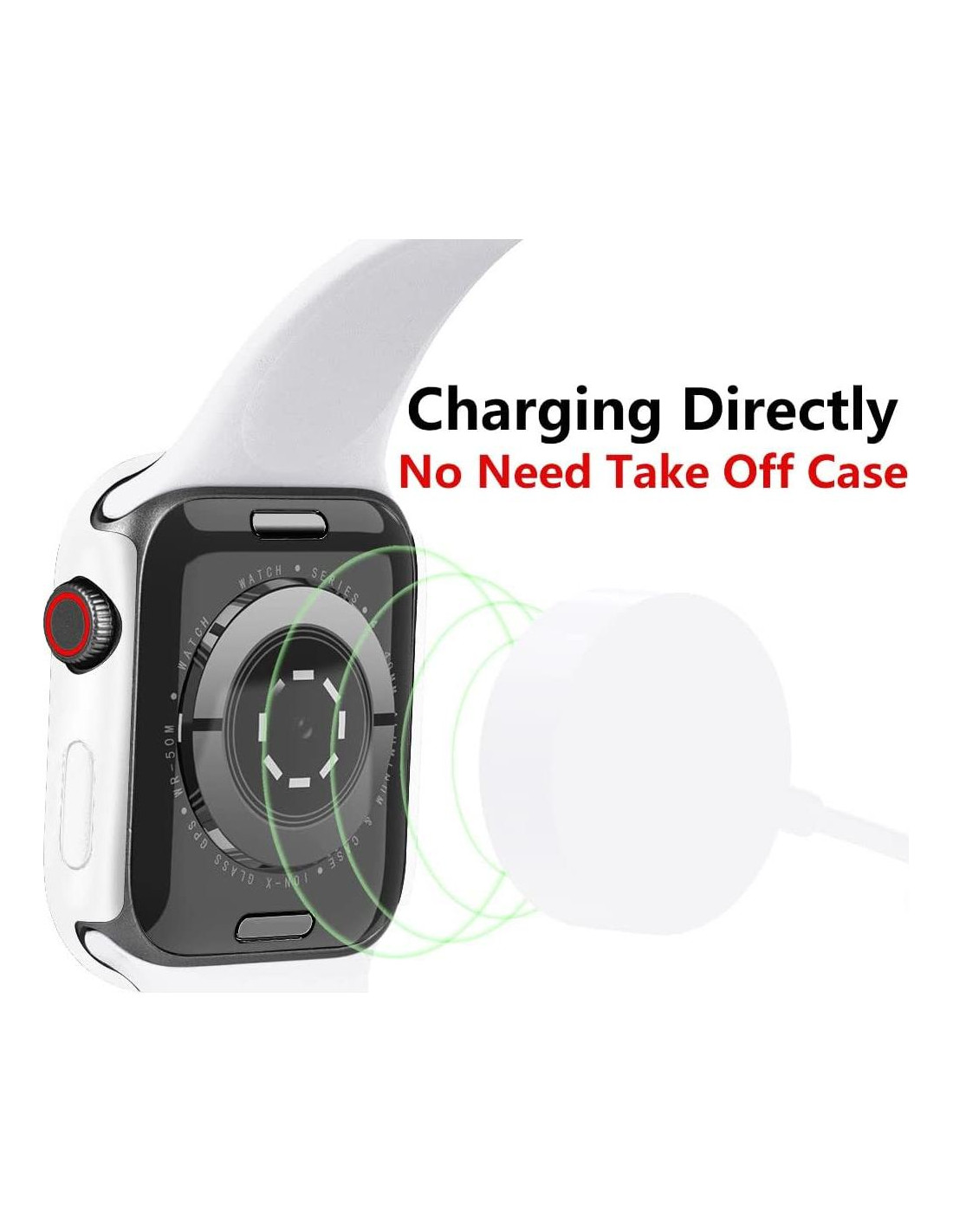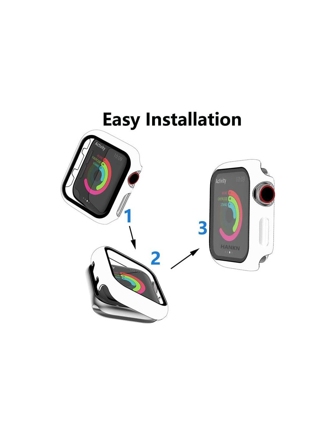 - 2. Diseño Todo-en-Uno: Esta carcasa de material PC tiene un protector de pantalla de vidrio templado HD, cubre toda la parte frontal y los bordes curvados del apple watch, proporciona protección general contra rasguños, caídas, roturas y golpes del uso diario.