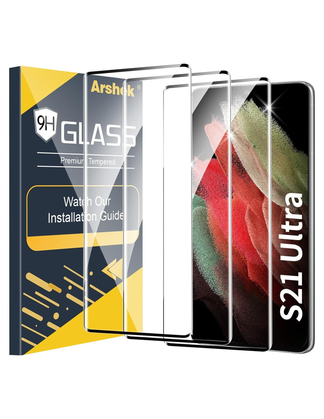 - Dureza 9H & 3X Más Resistente a Rayones. Mejora 10X a Prueba de Choques Militares con diseño de refuerzo en los bordes, el vidrio templado altamente duradero puede proteger eficazmente tu Galaxy S21 Ultra de rasguños y marcas no deseadas por llaves y otras sustancias duras. Paquete de 3. 3 Protectores de Pantalla están hechos de vidrio templado de alta calidad para Samsung Galaxy S21 Ultra (6.8 pulgadas).