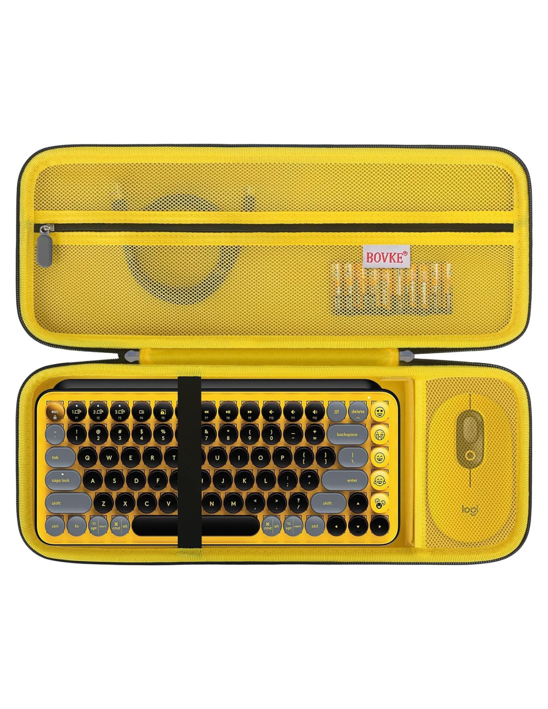- Esta funda para teclado Logitech POP keys viene con una bolsa de malla con cremallera para acomodar el teclado mecánico POP teclas emoji personalizables, teclas Logitech, cables de carga, baterías AAA adicionales y el teclado Bluetooth lindo Logitech POP keys más accesorios. la banda elástica interna ayuda a asegurar el teclado Logitech POP keys de golpes accidentales, caídas, mantiene tu teclado logi pop keys en buenas condiciones.