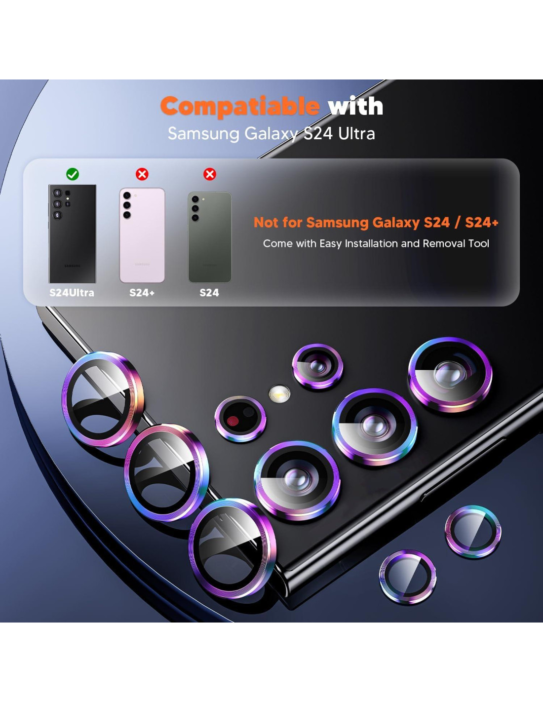 - ¡Nota! Esta lista de protector de lente de cámara para Samsung Galaxy S24 Ultra SOLAMENTE!! Por favor, no lo uses al mismo tiempo con la funda del teléfono que tiene su propia protección de lente. Al comprar 1 set recibirás: protector de lente de cámara S24 ultra + bolsa de alcohol + pegatina de polvo + herramienta de remoción + instrucciones de instalación