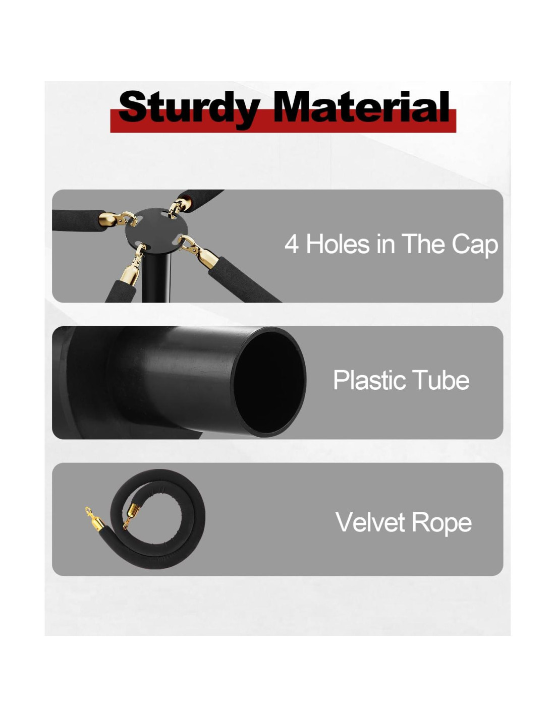 - Lista de Empaque: Recibirá 2 X bases de goma, 4 X postes de seguridad de plástico, 4 X tubos de conexión de plástico, 2 X tapas superiores de plástico, y 1 X cuerda de terciopelo negra de 1.52 m (5 ft)